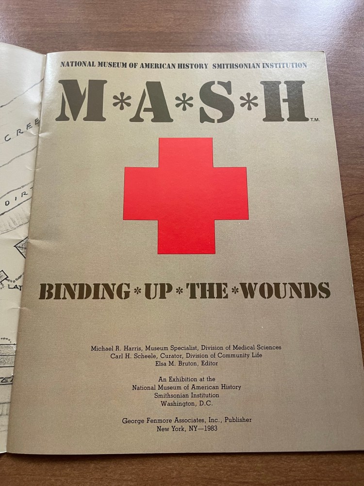 I imagine that the exhibit catalog for “M*A*S*H: Binding Up the Wounds” was a popular purchase for those attending the exhibit. It made for the perfect souvenir as it contained information about the series, photos of the objects in the exhibit, and showed photos from an actual MASH unit in Korea along side scenes from the series. Visitors could take home a M*A*S*H experience in the form of a 32 page book. Let’s dive into this exhibit catalog!