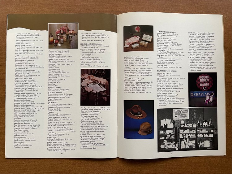 Finally, you learn that the items on display will become a permanent part of the Smithsonian’s collection joining other iconic objects from America’s past. The catalog wraps with a full two page spread containing every object donated from the series (images of these pages are at the bottom of the post). Each item from the set were divided into various categories within the Smithsonian’s collection including the Medical Sciences Division, Community Life Division, and Military History Division. Since some items were actual military objects, they will be a part of that section of the museum’s collection. The catalog also notes that a few items were loaned for the exhibit including an Emmy from Larry Gelbart and a first draft of the pilot script loaned by Gene Reynolds.