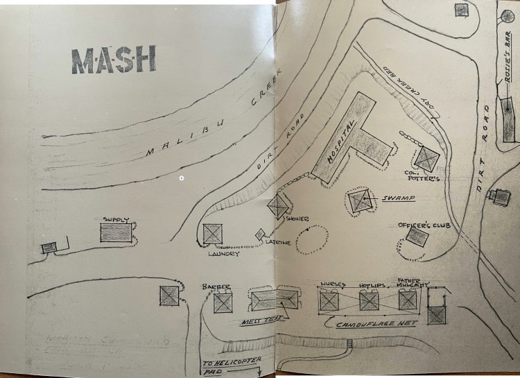 Let’s begin with the inside of the front and back covers. The image above has been stitched together, but the two inside covers create a map of the M*A*S*H set at the Fox Ranch (now Malibu Creek State Park). It appears to be a scan of a property map used by 20th Century-Fox Television to create the set. For fans who had wondered how the buildings were arranged, this was a great surprise. Of course, this is a different layout from what we saw on Stage 9. Since it was smaller, the tents were much closer together and some locations changed.