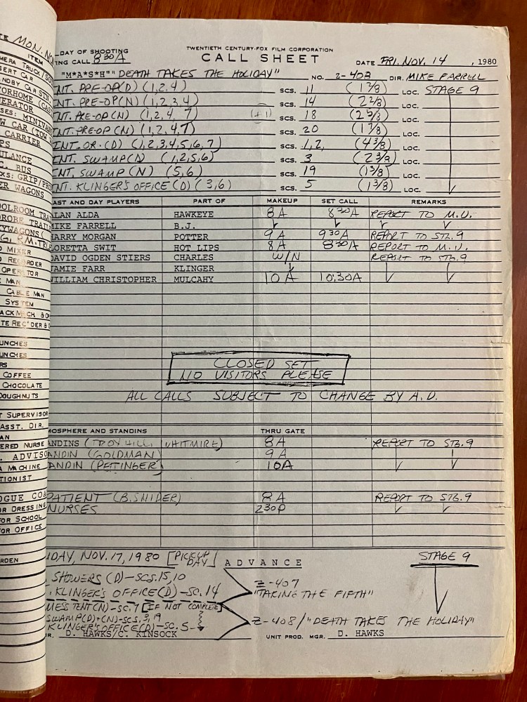 Throughout the script, Hill has marked all of BJ’s lines and handwritten several changes as he was expected to know what had changed. The script also includes a few sets of revised pages, call sheets, and the shooting schedule. It is a fairly complete script. Hill’s script gives us insight into one of the many jobs on the set of M*A*S*H that often went uncredited. To my knowledge, Hill’s name is not mentioned in any M*A*S*H credits. I know his story because I purchased this script, and several others, from his family. Meeting people who worked on set and the families of people who worked on set has been one of the greatest joys of collecting.