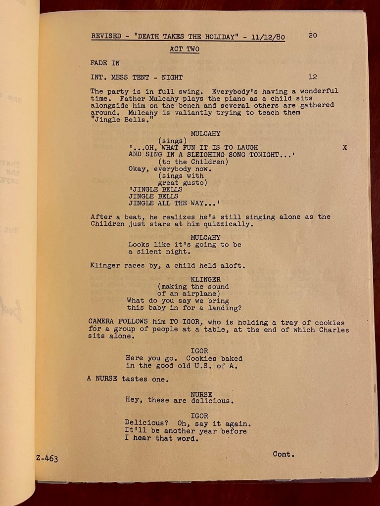 As for differences between the script and the final episode, there weren’t too many. Of course there are the usual minor changes of a word here and there because the actors are human. But there was a scene on page 5 where Hawkeye and BJ are hanging stockings (old Army socks) that didn’t make the final episode. Then on page 20, Father Mulcahy sings Christmas carols with the kids, and that didn’t make the cut either. As usual though, 90% of the script is as written, which is a credit to the writers and actors of the series!