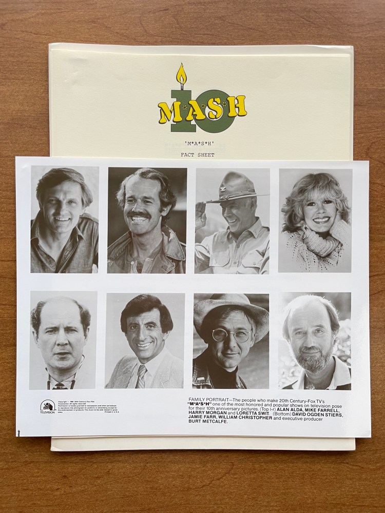 The final component of the press kit is an 8×10 glossy photo of the seven principle actors’ headshots along with the headshot of executive producer Burt Metcalfe. I am kind of let down by this photo montage. I would think that a nice cast photo would look better in print than just having one actor’s headshot. Then there’s the matter that only three of the actors’ headshots are scenes from M*A*S*H. The generic headshot feels like less of a tie-in with the series. I am surprised they didn’t use the photo of the cast together with the signpost.