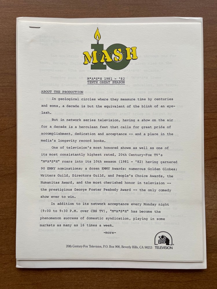 Like the Season 11 Press Kit I wrote about in November, the information in this kit gave journalists what they needed to write about the upcoming season of M*A*S*H. Overall, I really like this press kit. It tells the story of how Fox and CBS had to advertise. I know I keep harping on the fact that these materials were created before social media, but social media really has changed how a series communicates directly with its audience. In 1981, they could only indirectly communicate through TV Guide, local newspapers, radio stations, and television stations. M*A*S*H‘s tenth season was special as there weren’t many shows in 1981 that had achieved that kind of influence and longevity, and that continues to today.