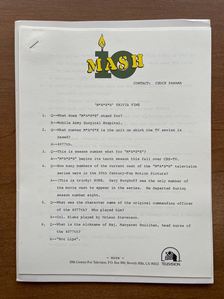 My favorite document in the press kit is the six-page “Trivia Time.” There are some pretty simple questions on the first page, but the questions throw back to earlier seasons by asking about McLean Stevenson, Larry Linville, and Wayne Rogers. One question also references the M*A*S*H spin-off, Trapper John, MD. In total, there are 58 questions. These would have been fun for newspapers or radio stations to use in trivia games, and I wonder if any local media took advantage of these questions in this way? I am sure Fox and CBS would have enjoyed the free publicity.