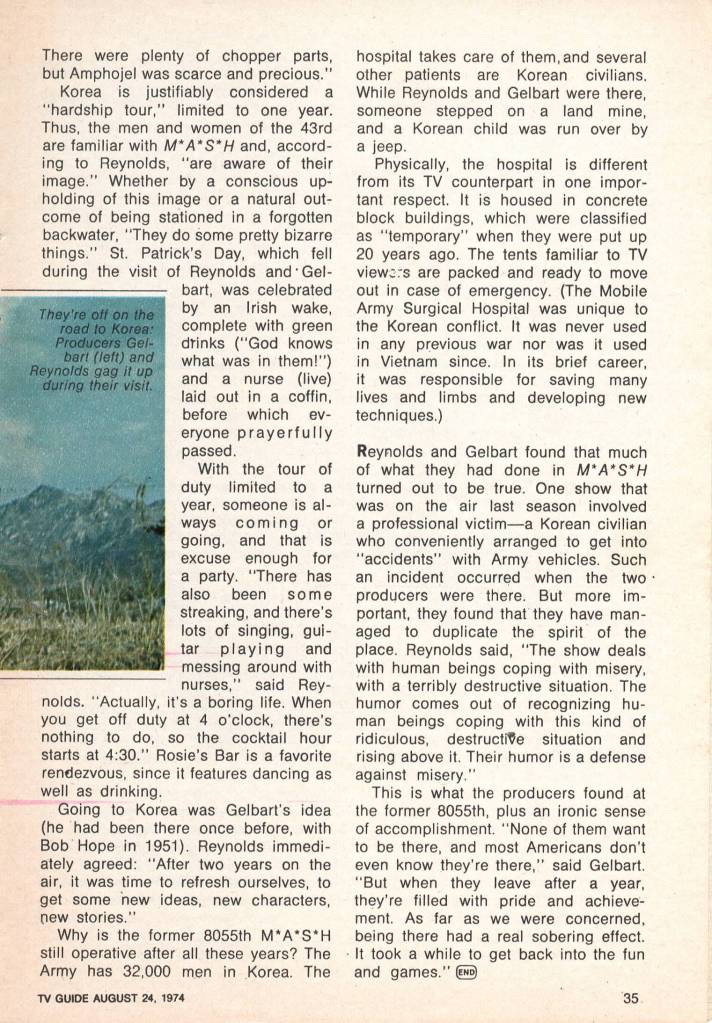 The following article appeared in TV Guide August 24, 1974. It is one of the earliest articles to describe Larry Gelbart and Gene Reynolds’s trip to Korea to research for the show and interview doctors and nurses that served in MASH units. This trip is famous within the M*A*S*H community as it contributed to what made the show more realistic, and that is addressed in the article. Gelbart and Reynolds discuss how what they learned from the trip would be integrated into the series beginning as soon as the third season, which debuted in 1974. One of those changes was the introduction of Rosie’s Bar, which was a real bar outside of the unit in Korea. The following is the full article as it appeared before the third season began. Instead of summarizing, I felt it was better served to present the article in full.