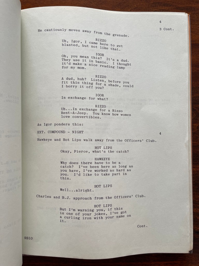As far as differences between the final episode and the script, there weren’t too many other than the typical minor word change here and there. Since this copy does not contain any revised pages, there are some line changes. The first appears when Hawkeye and Margaret are first discussing the idea of time capsule in the Officers’ Club. There are also a few line changes between Rizzo and Igor when the grenade changes hands. The biggest change came at the end as the time capsule was buried. In my script, there aren’t as many objects shown going into the time capsule as there were in the episode.