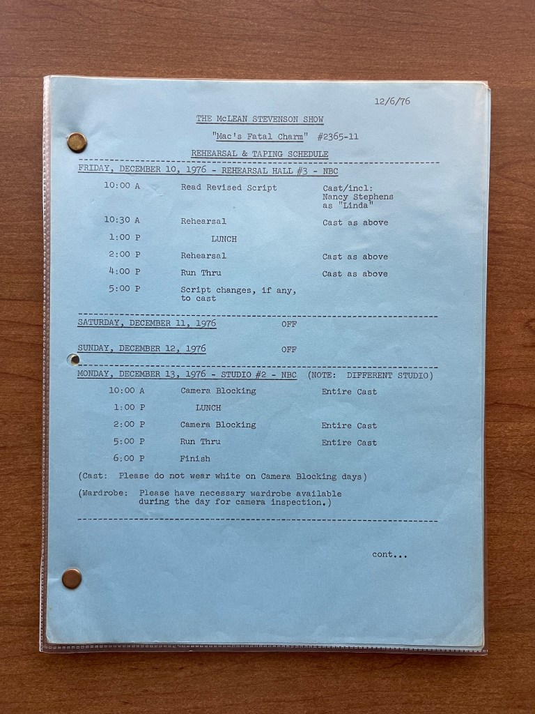 Comparing this script to M*A*S*H scripts, it is hard to say. I am not 100% confident that this script is complete. It appears to be missing the front and back cover. There also isn’t a title page, set list, or character list as there are in every M*A*S*H script. It is possible, however, that since The McLean Stevenson Show was produced by NBC that their operating standards were different from 20th Century Fox. That being said, the script does include the Rehearsal & Taping Schedule (the episode was shot in four days, which is fairly standard), a Short Rundown, and 42 script pages. The pages are yellow and blue, and there aren’t any revised pages. This script provides some insight into how this show was made and the slight differences between it and M*A*S*H.