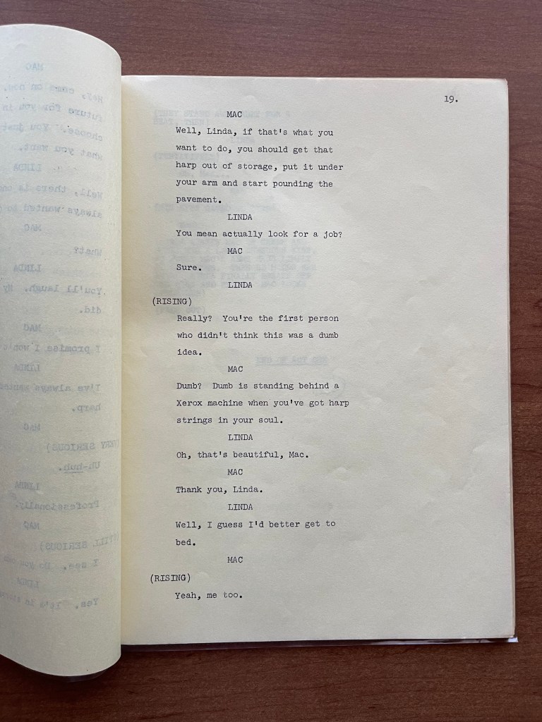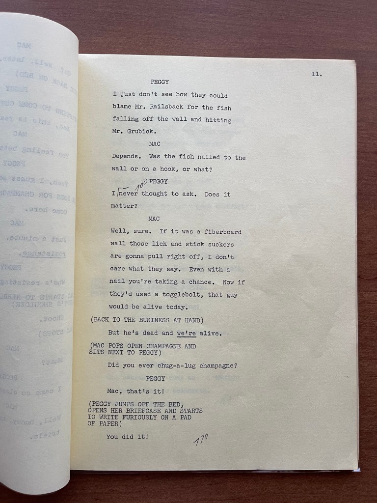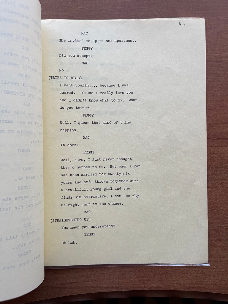 What I have in the collection is a script for the fourth episode of The McLean Stevenson Show titled “Mac’s Fatal Charm.” The episode’s primary storyline is one in which Peggy’s friend Linda visits. Recently divorced, Linda is attracted to Mac, and he begins to wonder if he is capable of infidelity. I cannot find the episode itself, but reading the script, Mac is disturbed because he was flattered by the attention of a younger woman, and might have been tempted. Overall the episode has a few good jokes, but it feels cliché for the era.
