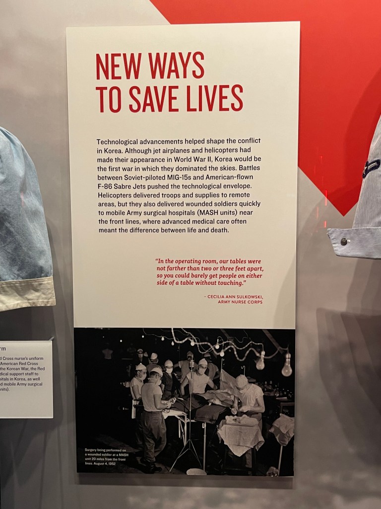 At this point, you are probably wondering where the connection to M*A*S*H comes in. Besides being about the Korean War, there are some interesting connections to the show in the exhibit. Truman, the firing of MacArthur, the Chinese invasion, and other topics covered in the exhibit are either featured or mentioned in the series. But the more solid connection to M*A*S*H, is in one of the display cases. The exhibit features a surgical light, litter, nurses uniform, medical kit, and informational text titled, “New ways to save lives.” This is, of course, about MASH units. Korea was the first time the Army used the MASH concept, and it worked very well. Treating wounded closer to the front saved lives. Seeing these artifacts on display brings the stories in M*A*S*H into full context. We see the 4077th as a unit in the middle of a war, but there was so much more going on in Korea and the world at the time. This exhibit does an incredible job of demonstrating that.