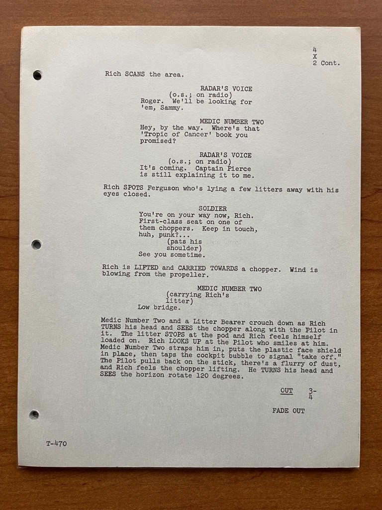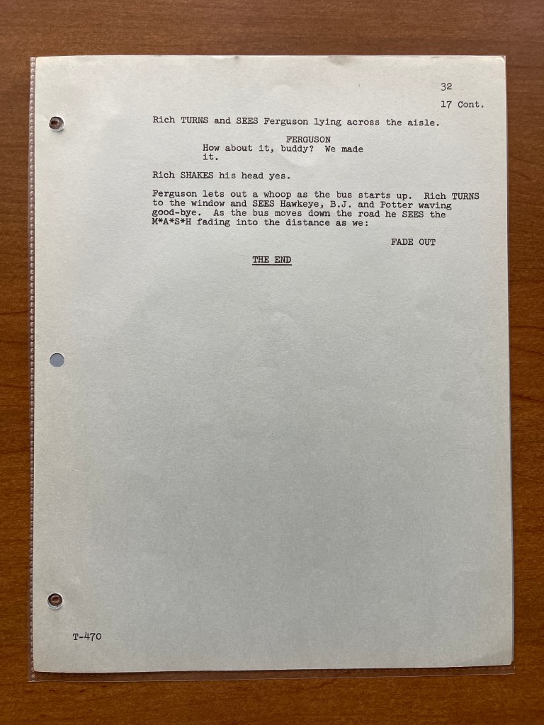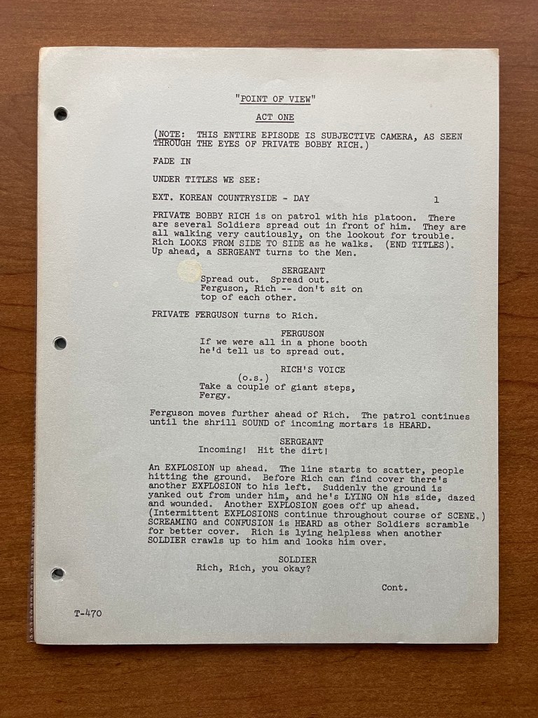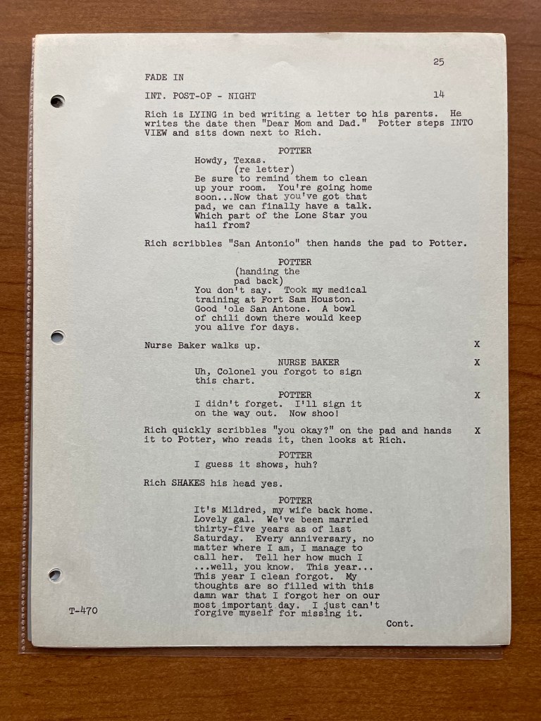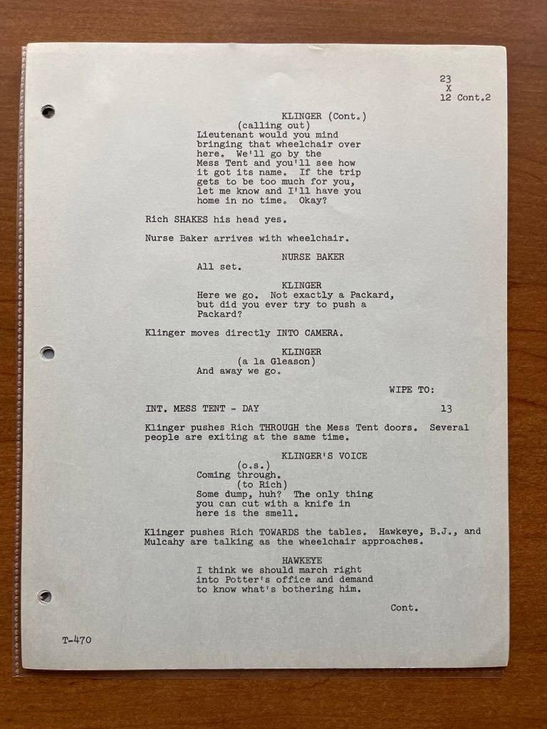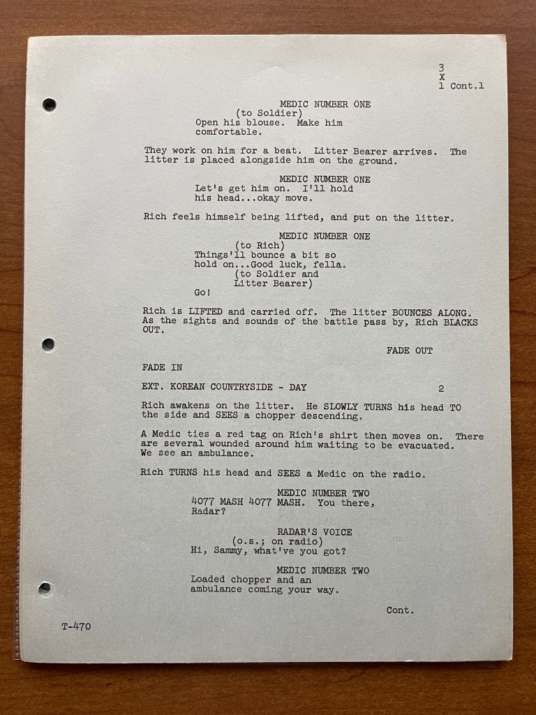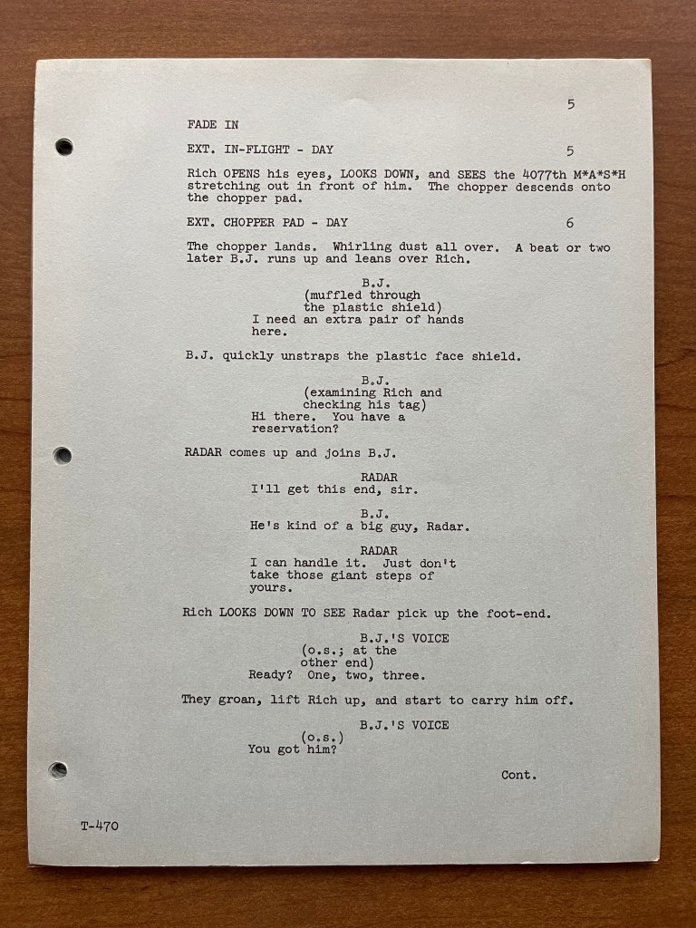 Unfortunately, this copy of the script doesn’t have any of the production documents such as the call sheets or shooting schedule. This is one instance where I wish it did because it would have been interesting to learn from the call sheets who played Private Rich! That is still a mystery to this day. We hear his voice a few times throughout the episode, but we don’t know who recorded that voiceover or whose legs and feet we are seeing. This was a topic on Episode 61 of the M*A*S*H Matters podcast. Despite this script not having the production documents, the episode “Point of View” is really about the unique perspective, and the script provides great insight into how that was planned.