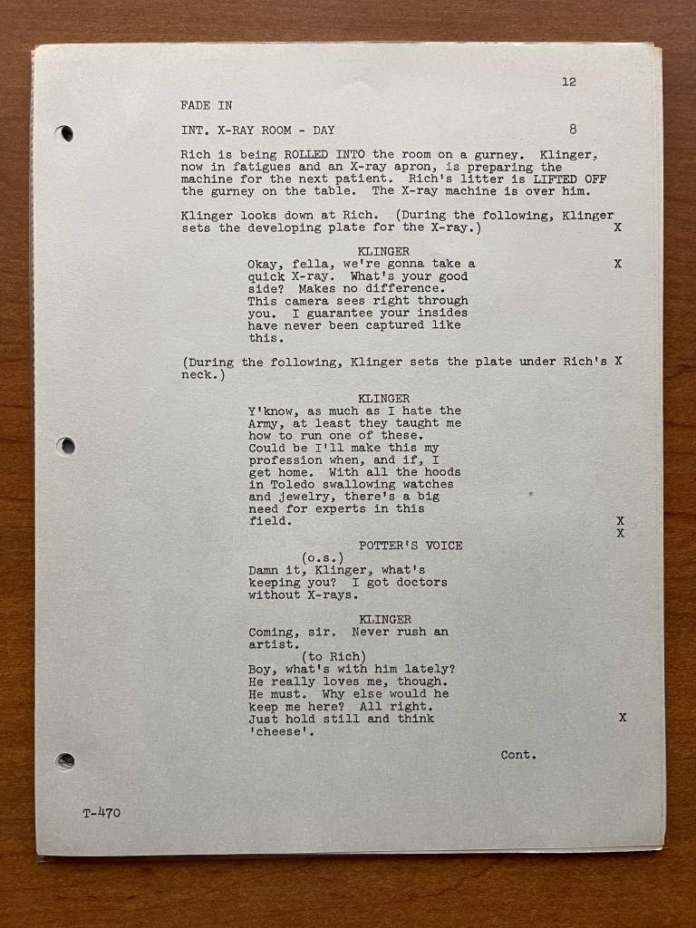 I wanted to include a photo of the title page, not because it is different, but because it gives credit to the writers of this episode. Ken Levine and David Isaacs wrote 19 episodes of M*A*S*H, and this was by far their most daring and innovative. In a post on his blog, Levine writes about the episode “Point of View” and their reasoning behind it. He recounts his horror of seeing the episode for the first time on a theater screen, and how off putting it felt seeing the characters’ giant heads on the screen. Thankfully, he says, it worked on a television screen much better. I highly recommend reading his blog post (after finishing this one, of course!).