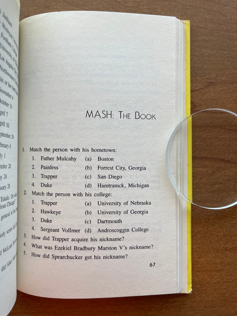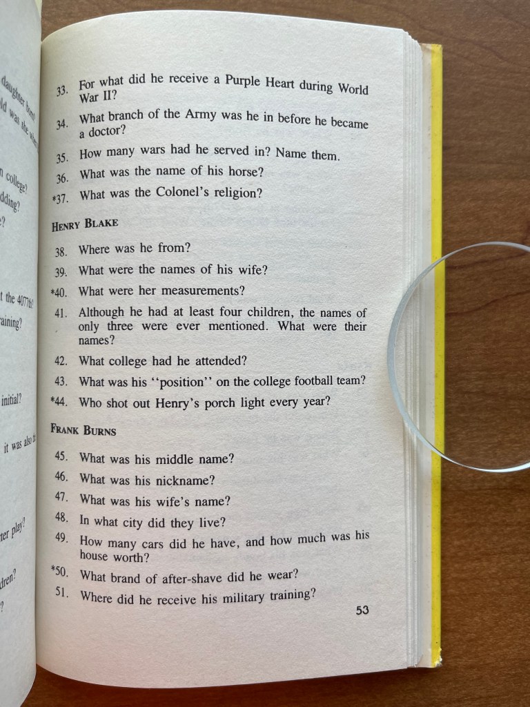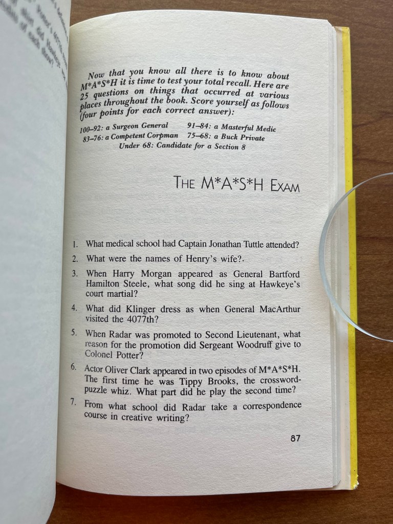 Another benefit of the unofficial quiz manual is difficult questions are marked with an asterisk (*). Difficult in this case can mean obscure, but there are some legitimately difficult questions in the book. They are aiming to test your memory! Another benefit of this book is that there is a M*A*S*H Exam at the end. There are 25 questions, and you take the number of questions you got right times four to get your overall score. You are then given a rank based on how many questions you got right. Think of it as a Buzzfeed quiz, but 23 years before the site’s founding.