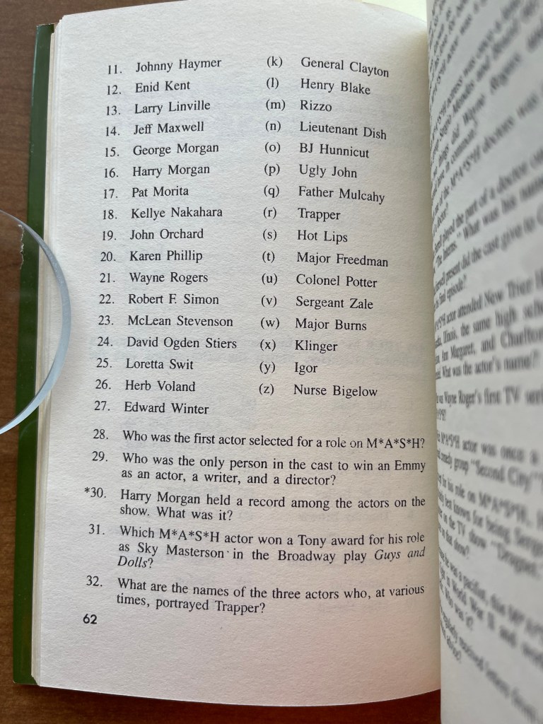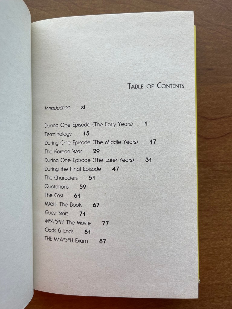 In a vacuum, the unofficial quiz book is very good despite not being licensed. The questions cover a wide variety of topics and are very well organized. I would argue that the organization of the unofficial quiz book is better than the official quiz book. Instead of being 101 separate quizzes, the unofficial quiz book breaks its questions up into 14 manageable categories. Topics covered in this book include episode specific questions (broken up into 3 date ranges), terminology, characters, the cast, guest stars, and more. One benefit of the unofficial quiz book is that it has quizzes for the Korean War, Richard Hooker’s MASH novel, and Robert Altman’s MASH film. The official quiz book only covers the series.