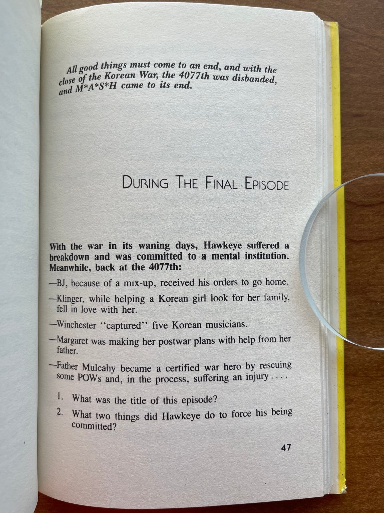 As with the last quiz book, I haven’t had the time to sit down and verify whether all of the answers are correct. I am sure there are errors in this book given how quickly the book was published and how difficult it would have been to access the back catalog of episodes. This was long before M*A*S*H was available on VHS, DVD, or streaming. In 1983, no one would have known was streaming was!