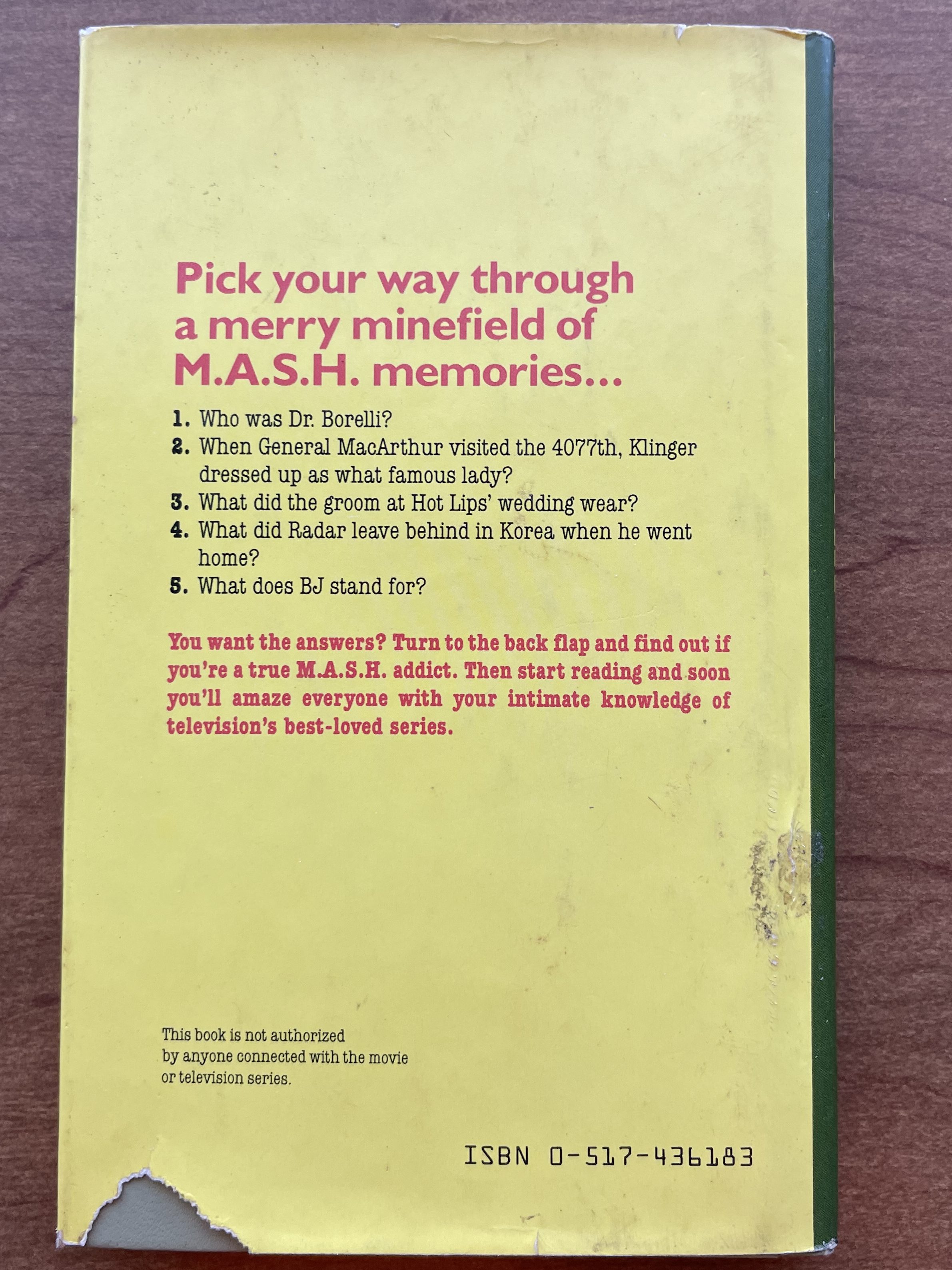 Overall, this is a fun piece of M*A*S*H history. It beat the official quiz book to the market, and was likely something that fans would have bought (sadly, I have not been able to find sales figures for either title). The book is fairly inexpensive, and it is a good book to add to a M*A*S*H collection along side the official quiz book.