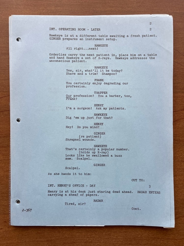 For the most part, the script follows the episode fairly well. There are a few differences, however. There are several scenes that are longer in the script than they are in the final episode such as the opening O.R. scene and the scenes between Frank and Margaret as they slowly get more and more drunk. Oddly, there are a few nurses whose names are different. Nurse Cutler, who we met in “Requiem for a Lightweight” (01×03) is simply known as “Nurse Two.” And Sheila (one of a few actresses to be Nurse Sheila), who was in several season one episodes, is named “Nurse One.” Not very personal. (MASH4077TV.com has a really good article on the name changes and nurse changes in the series.)