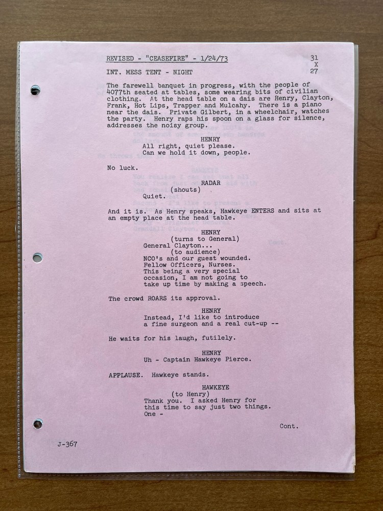 Eagle eyed viewers have noticed that the next to last episode of season one is called “Ceasefire” (01×23). I have always wondered if this episode was written as a way to end the war if M*A*S*H had been cancelled at the end of the season, in case Mrs. Paley didn’t get her way. I recently acquired a copy of the script, and I was hoping there would be an alternate ending where the war did end. But no such luck. It is possible that a different scene was written and filmed, but it just isn’t included in this script. (It is also possible that the series may have been cancelled after this episode aired.) Either way, the ceasefire being called off is the only ending offered in the script. Despite that minor disappointment, let’s take a look at this season one script and see how it differed from the episode that aired in 1973.
