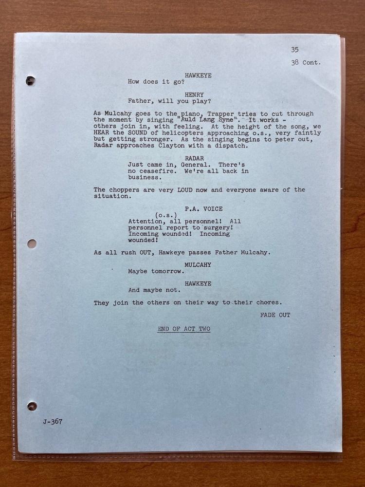 This copy of “Ceasefire” doesn’t have too many frills. There’s no shooting schedule or set pages. As with every script, the episode’s title page credits the writers. For this script, something is a little different. The story is by Robert Klane while the teleplay is by Laurence Marks and Larry Gelbart. So what does that mean? Simply put, Klane had the idea for the storyline, but it was Marks and Gelbart who wrote the script. In a recent episode of the M*A*S*H Matters podcast, Allan Katz talks about the differences in writing credits and script writing process in more detail.