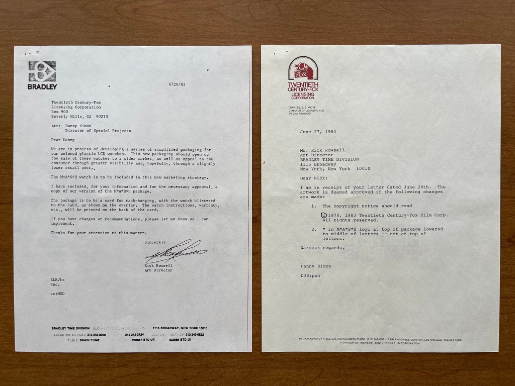 While these letters don’t give away too many details, but they do provide insight into the product licensing and marketing process. The first letter, dated June 20, 1983, is from Bradly to Fox. In it, they describe new packaging for the M*A*S*H watches that will make them easier to display on shelving, thus easier to sell in more locations. A few things we can learn from this letter is that M*A*S*H watches were already on the market in 1983. They are asking for Fox’s approval of the updated design to the packaging.