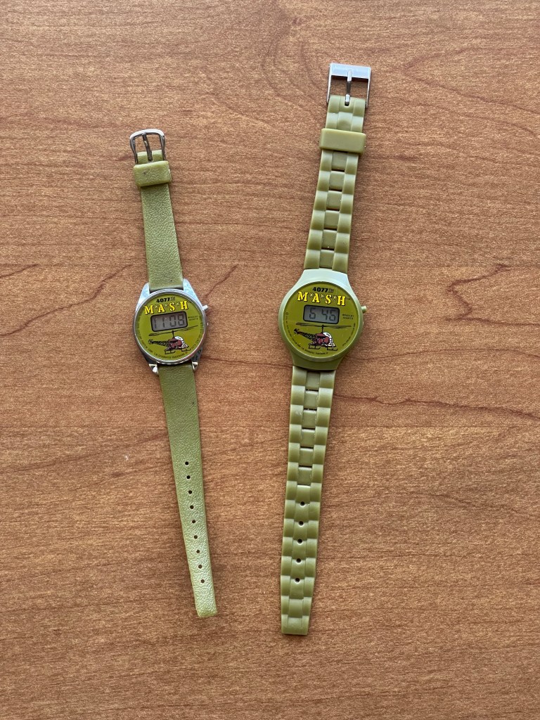 I have two Bradley watches in my collection. What is amazing about both is that they still work! They are not mechanical, so to find 40+ year old quartz watches that haven’t suffered corrosion is pretty incredible. The watches are very different styles despite sharing a similar dial design. The M*A*S*H logo appears along with 4077th at the top. At the bottom, we see a drawing of the Bell H-13 Sioux helicopter used in the series. The watch on the left features a faux leather band and is dramatically smaller than the other. This was likely made for a young child. The watch with the rubber strap on the right has a larger band, but it does not fit my 7″ wrist. These were definitely not made for adults!
