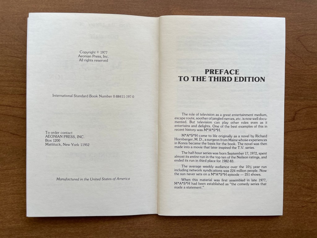 This copy is the be third edition, published in 1983. That is telling as the book was popular enough to be reprinted at least twice. In the updated Preface, Clauss says that “We herewith present again, the viewers guide to the first five years of M*A*S*H. Next, the entire run…” I have done some research, and I cannot find any evidence that an updated edition of this book was ever published with all 11 seasons. Mostly likely, since the final printing was in 1983, it was overshadowed by the other books about M*A*S*H that were published. Nevertheless, this is a great relic of the series as it demonstrates that fans wanted to learn more about their favorite show even though it would continue for another six seasons.