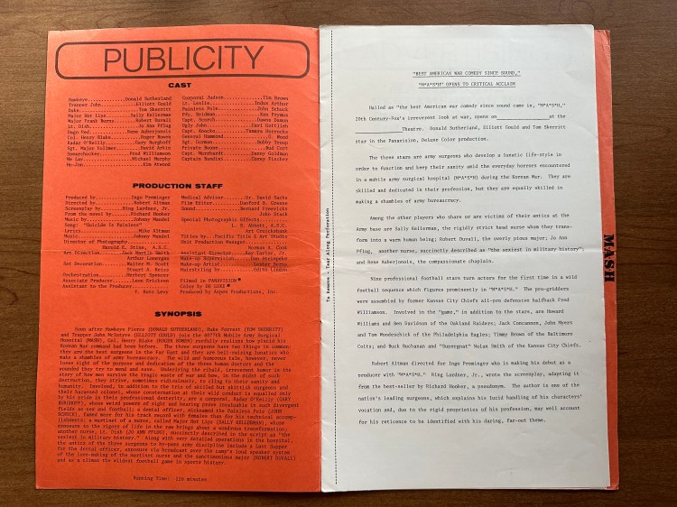 What strikes me most about this press kit is the simplicity. Today, we see press kits that include DVDs, t-shirts, gift bags, and various other swag items. In 1969 and early 1970, 20th Century-Fox just needed to get the word out about MASH since it was a fairly low budget production. Nothing fancy was needed. Of course, the movie did well and spawned one of the most successful television series in history. The film has become a classic along side the series despite the difference in tone in each. The publicity clearly worked as MASH was successful at the box office rounding out 1970 in the top 5.
