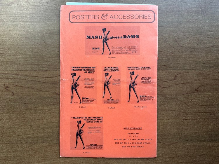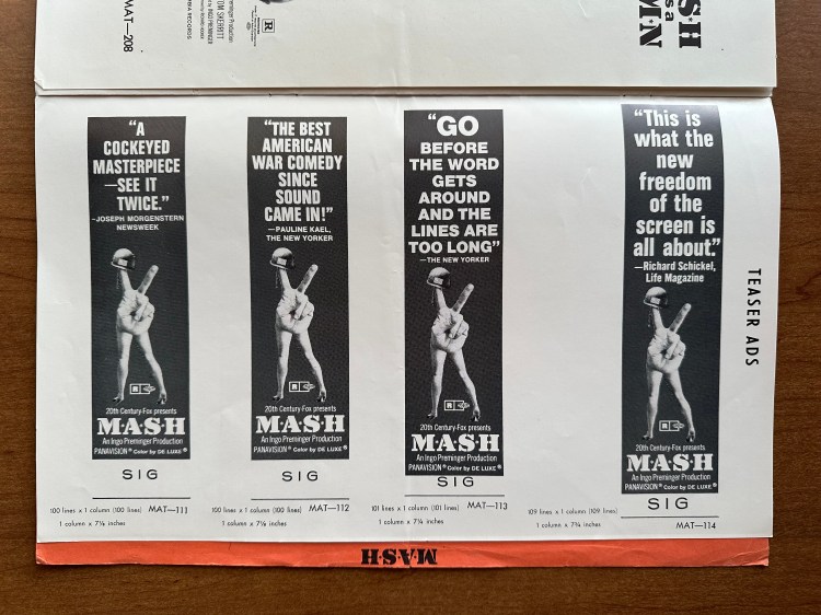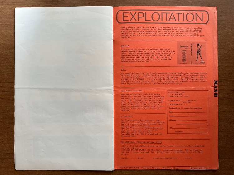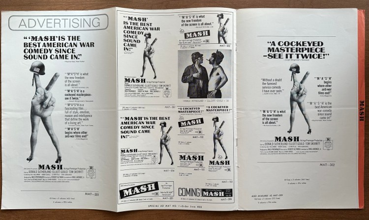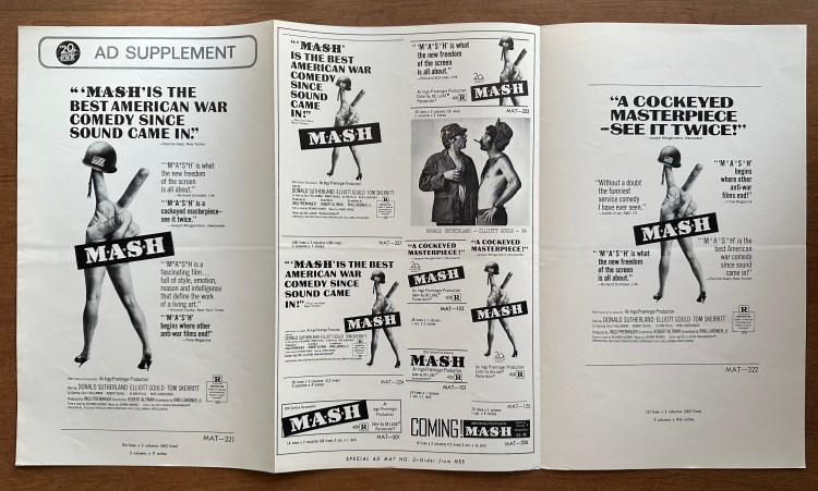 When the movie MASH debuted in January 1970, it was an unlikely hit in the midst of the Vietnam War. Add that MASH was a comedy, and it seemed even more crass than a film about war at the time. While the movie was about the Korean War, the anti-war commentary was just as applicable in 1970 in the United States. A movie that mixed the horrors of war with comedy (something the television series M*A*S*H would later do) proved to attract audiences. The Robert Altman film went on to be very successful at the box office. A lot of that success was due in part to a successful advertising campaign and taking advantage of widely read publications. This Pressbook is an example of what 20th Century-Fox sent out to promote the film and the material that they provided publications.