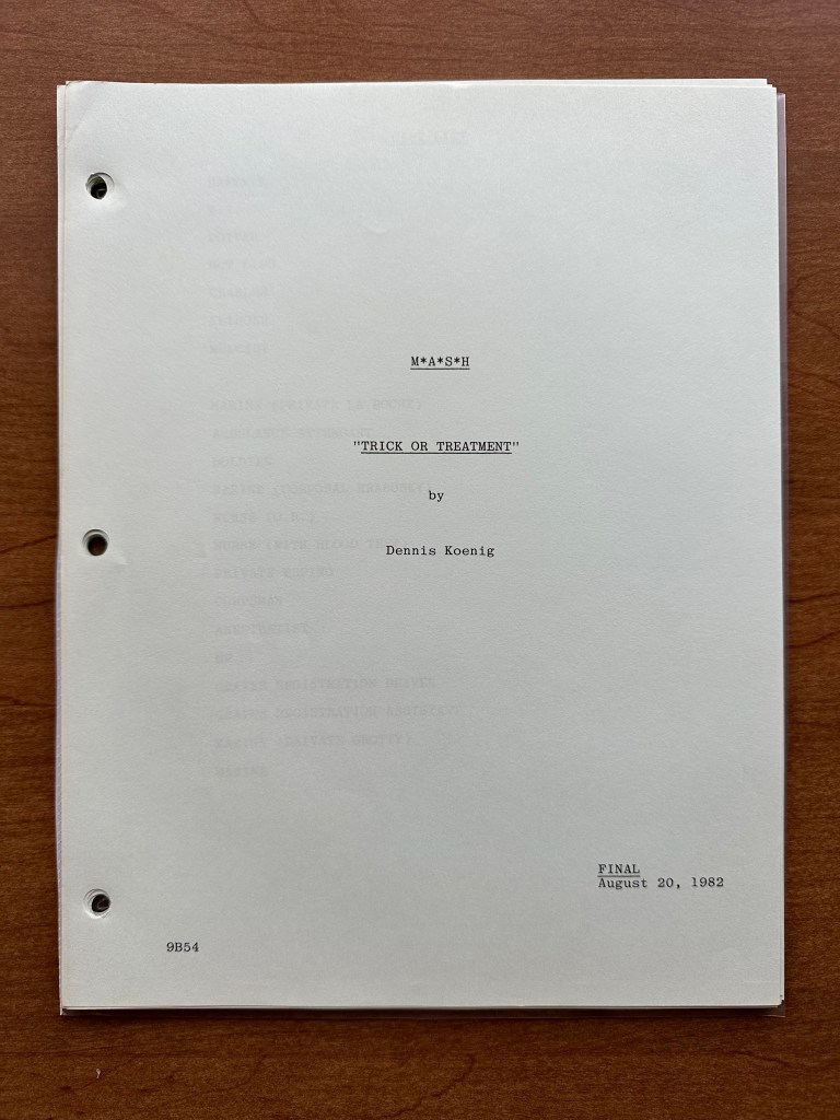 Since today is Halloween, there was only one choice for this week’s Script Spotlight post: “Trick or Treatment” (11×02). This episode is from season 11, and is the only episode of M*A*S*H was a Halloween theme. We see several characters dressed up including Hawkeye as Superman, BJ as a clown, and Col. Potter as a cowboy. The copy of the script I have for this episode is fairly simple, but let’s take a look at the script and this episode of M*A*S*H!