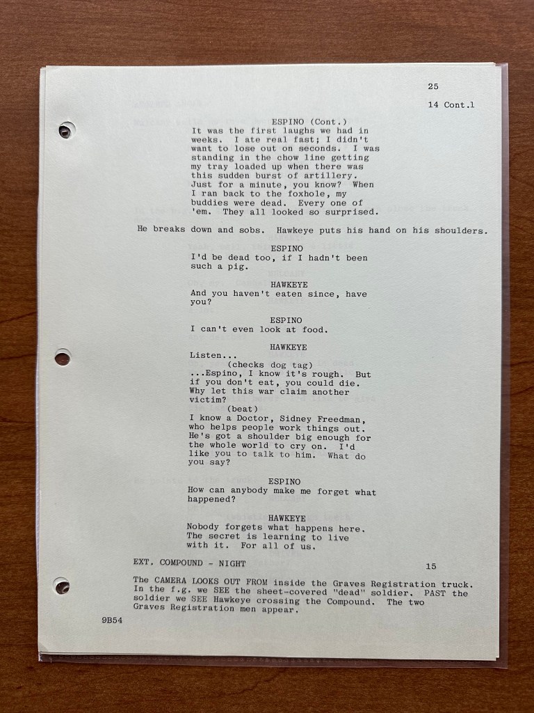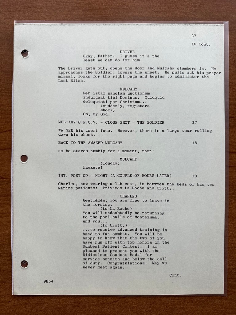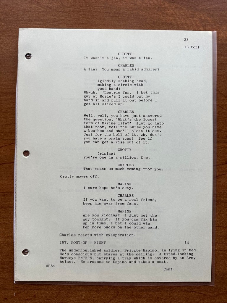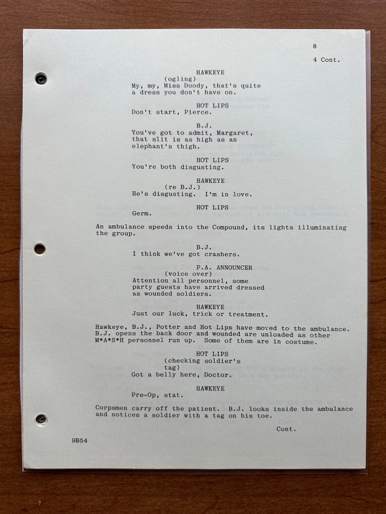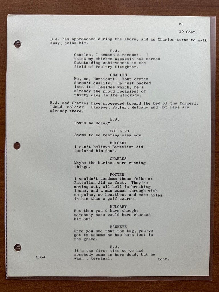 When comparing the script to the final episode, there were a number of changes. Again, I am sure that is because this is an earlier production draft of the script. In the episode, there is a small storyline running throughout where the generator is going the fritz, but that is not in this version of the script (page 11). There are also several scenes that are shorter including the one between Charles and Marine who got into a fist fight with an electric fan (page 23). Another change I noticed was the name of the soldier who refused to eat is different (Private Scala is what he is called in the episode, but he is listed as Private Espino in the script). Finally, near the end, Charles taunts the Marines in post-op, and that scene is pretty different as well (pages 27-28). One of the funnier changes I noticed was on page 8 when Hawkeye uses the term “trick or treatment” which is, of course, the title of the episode. That line does not appear in the episode!