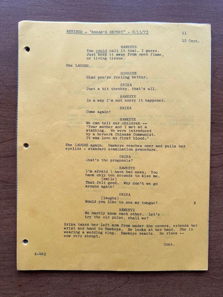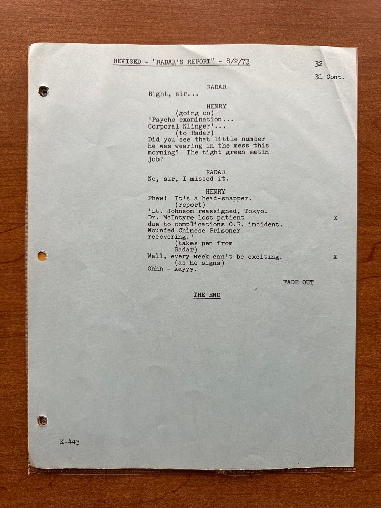 Typically I try to choose a script that is related to an event or holiday that is coming up. However, there isn’t much happening in March besides St. Patrick’s Day and the beginning of spring. So this week I decided to pick a random script from the collection to review. The episode that I selected was “Radar’s Report” (02×03). This is a great early episode that stands out in my mind for several reasons. It blends comedy and drama well. The episode guest stars Joan Van Ark as Lt. Erika Johnson, and it marks the first appearance of Allan Arbus as Major Freedman, although his name changed a few times. Let’s dig in to the script, then take a look at the final episode!