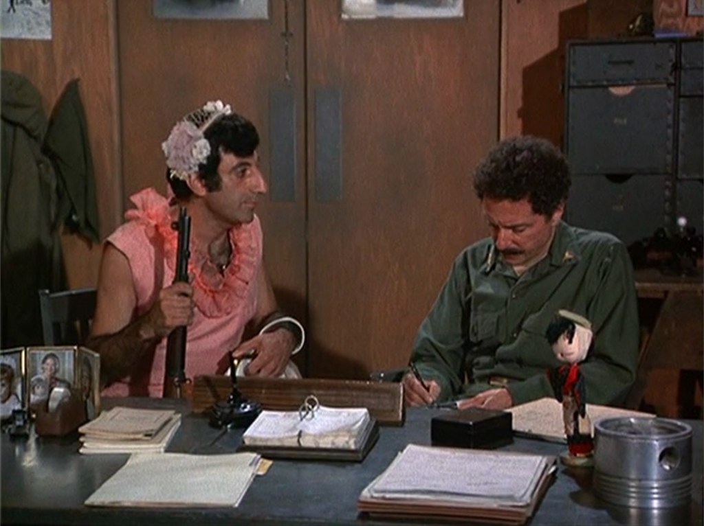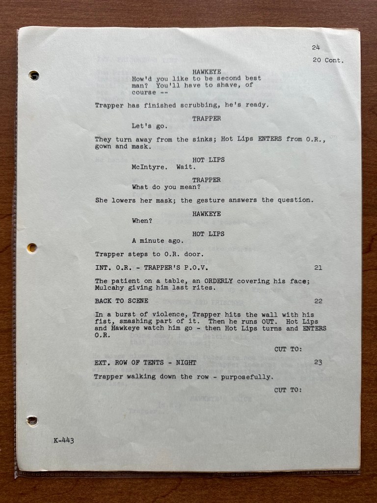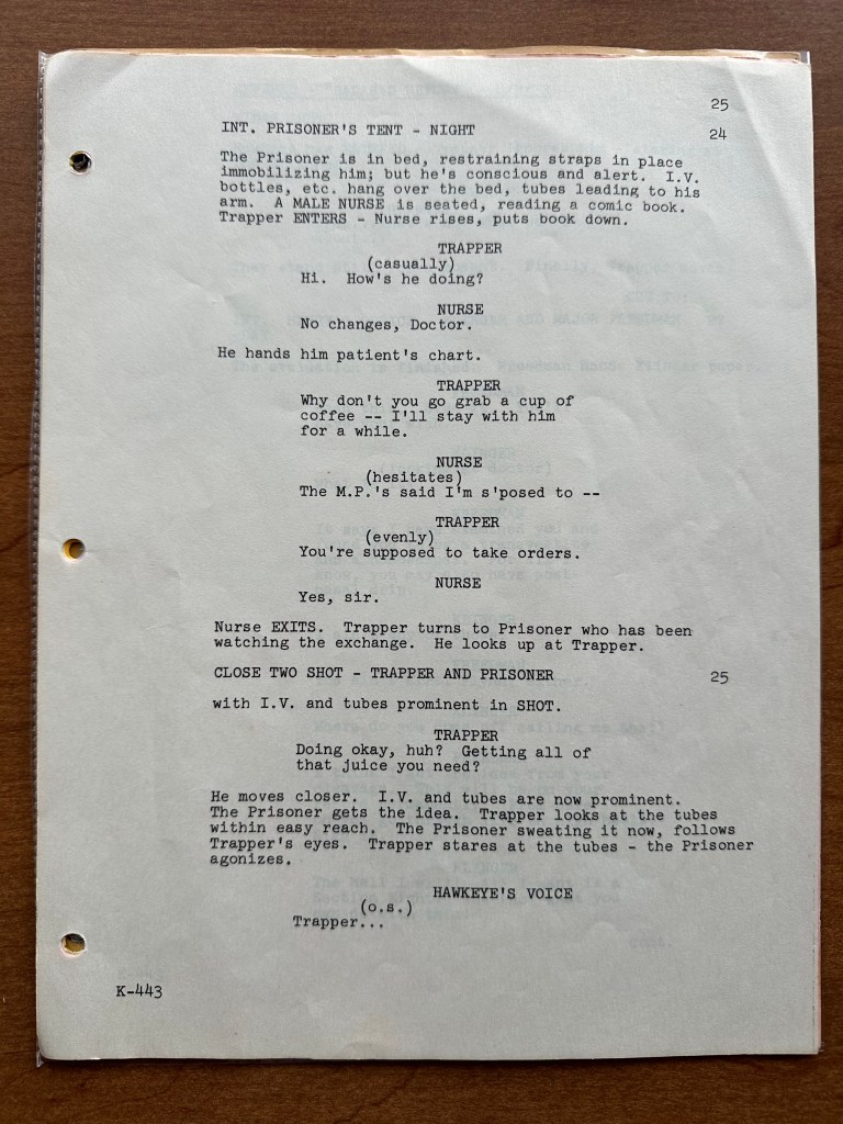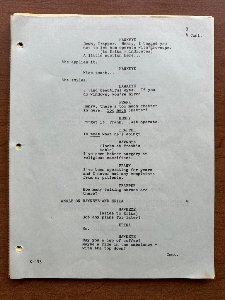 Season two is my favorite, and this episode is one of the highlights of the season! It is funny, shows the horrors and unfairness of war, and spotlights several of the characters (Hawkeye, Trapper, and Klinger). This is a very well balanced episode. Nevertheless, there are some changes between the script and what aired on CBS in 1974. The opening scene in which we meet Erika is longer in the script (pages 2 – 3). The scene in which the POW cuts Erika and affects Trapper’s surgery has several differences (page 6). But one of the most dramatic scene changes was when Trapper goes to the POW after his patient dies (pages 24 – 25). We get the impression that Trapper is going to harm him like he harmed his patient. In the script, Trapper punches the wall in pre-op before going to where the POW is being held. Then, he dismisses a nurse who is overseeing the POW. The scene is much darker as written, and I am sure that is why it was pulled back some for the episode. Trapper is angry and is seeking “justice” in his anger, but he is stopped by Hawkeye.