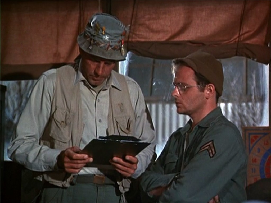 In the episode, we see Radar writing the Weekly Activity Report and Personnel Record for October 17 – 22, 1951 (which looking at a calendar for 1951 is Wednesday through Monday). He recounts the events of the week in which they work in the O.R. and a POW attacks a nurse and interferes with Trapper’s surgery. Klinger is given a psych evaluation by Major (Milton) Freedman. While Hawkeye takes care of the injured nurse, Erika, he falls in love her only to have her throw cold water on his idea of their married future. Meanwhile, Trapper’s patient dies as a result of the actions of the POW, who is recovering from his wound. In the final scene, we see Henry reading the report before signing it and remarking, “Well, every week can’t be exciting.”