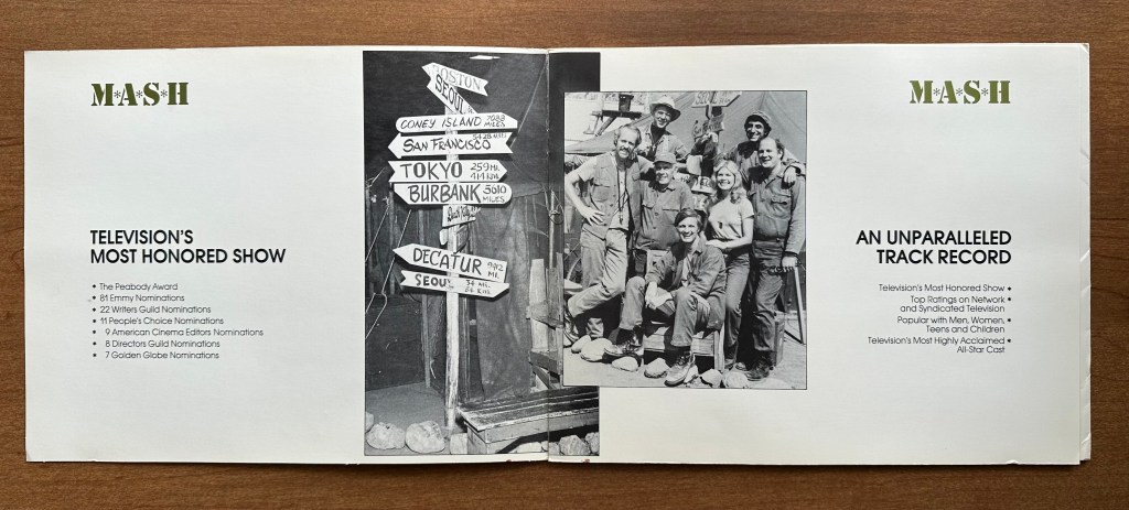 The front of the brochure has a dog tag with the M*A*S*H logo. There are five pages of material pitching to retailers why they should sell M*A*S*H merchandise in their stores. The show’s awards are highlighted. So is its popularity with men, women, teens, and children. The popularity of the cast is touted. The shows success in primetime and syndication is applauded. And one line says it all, “The bottom line: M*A*S*H: The most powerful program in television history for over a decade.” There are some very interesting stats quoted as well. At the time, M*A*S*H was the #2 rated show on television. The series reached about 224 million people weekly. It was shown in some markets up to 16 times per week. The show was #1 in many of the key demographic groups. And Alan Alda was ranked #1 rated male TV performer out of 150 (Mike Farrell and Harry Morgan tied for 5th and Jamie Farr was 7th). Loretta Swit was ranked the #5 television TV performer out of 125. The series definitely had the public’s attention.