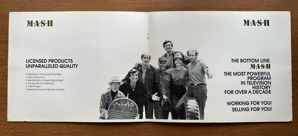 In a pocket, at the middle of the brochure, there are individual brochures for the products themselves. Each company with an official M*A*S*H license had a one page flyer (sometimes double sided) advertising their M*A*S*H merchandise. There was a wide variety of items available including toys, clothing, beach towels, a calendar, posters, tote bags, greeting cards, bedding, and there was also a flyer for David S. Reiss’ book M*A*S*H: The Exclusive Inside Story of TV’s Most Popular Show. The number of available products is overwhelming, but M*A*S*H was a very successful show, so there was demand for anything M*A*S*H related at the time. There are other items that I know of that aren’t even in this kit, but I think they were released as the series ended or shortly after to capitalize on the success of the finale. (Learn more about the M*A*S*H licensees in this post about a 1981 Licensing Conference Kit.)