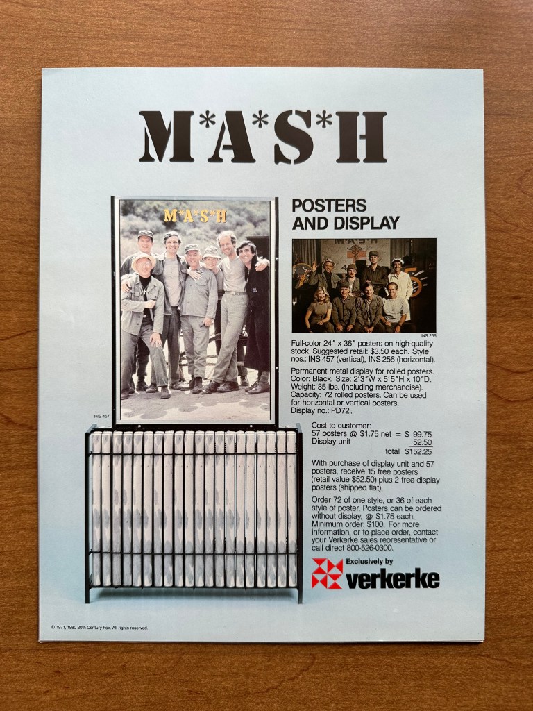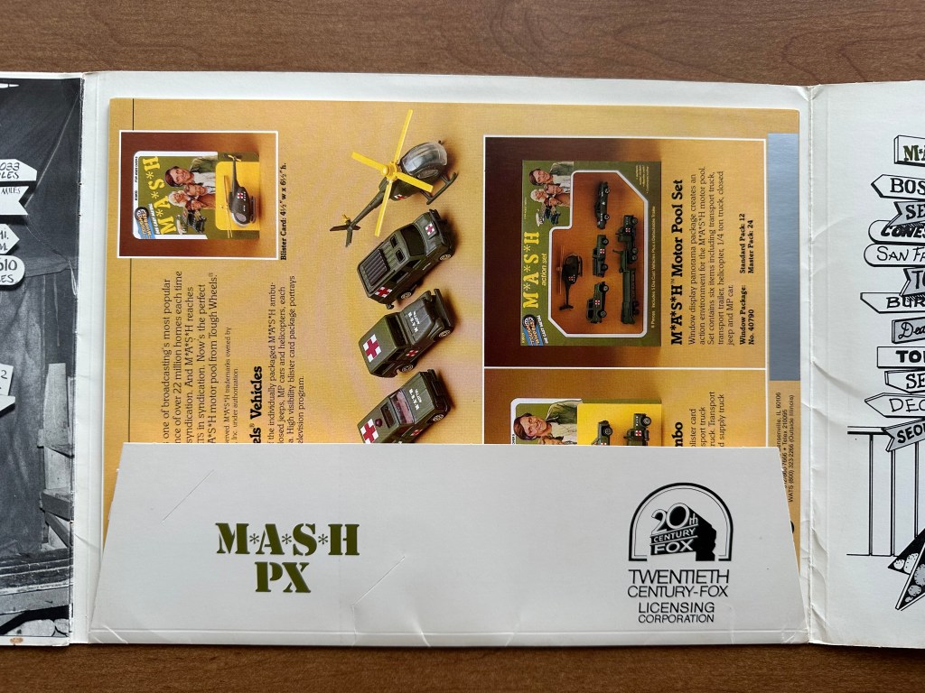 The goal of this brochure was for retailers to be able to capitalize on the show’s popularity by advertising the products that were officially licensed by Fox. We’ll get to the actual products in a moment, but one of the most interesting offers in brochure was the Point of Sale Survey. The survey was to gage interest in special M*A*S*H display items in retail settings. The coolest item was a 72 inch tall replica of the sign post. There was also a proposed smaller 24 inch version. The survey makes it clear that this was only a survey and “NOT an order for point of sale material.” So, I wonder, was any of this material ever produced for retailers? I would love to have a six foot tall replica of the sign post!