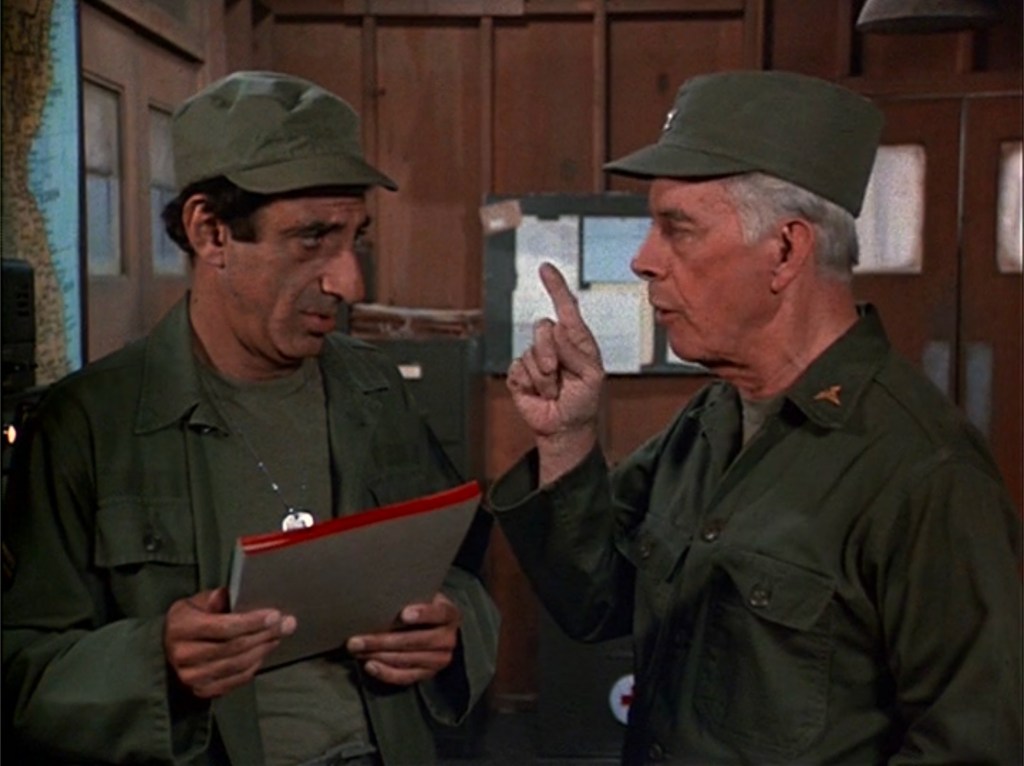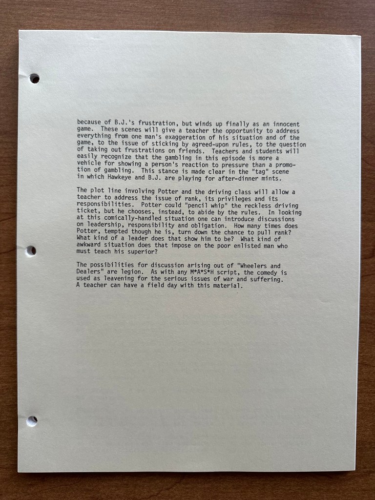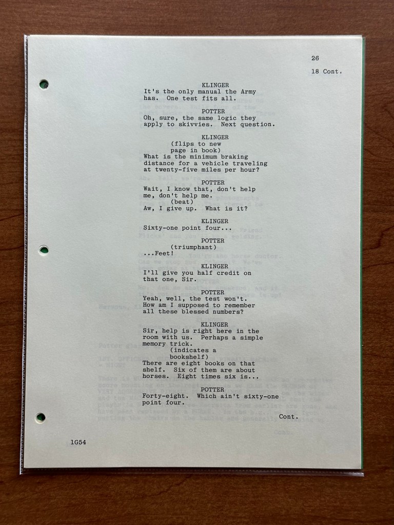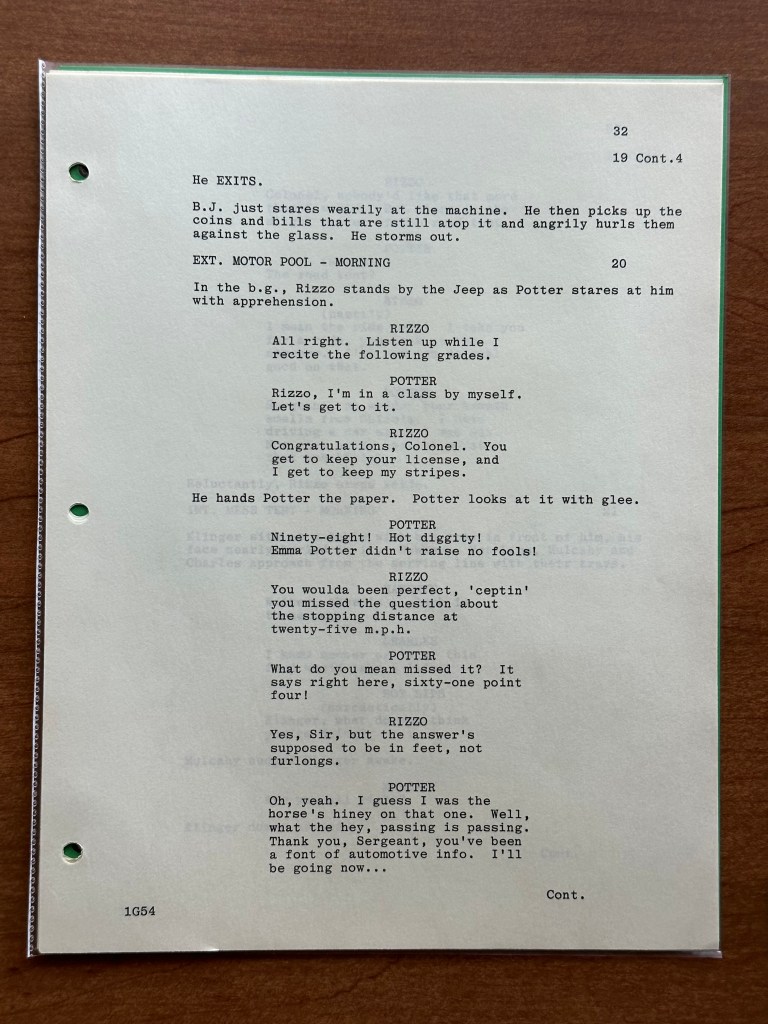 There are a few interesting changes from this draft of the script to what we saw on tv. At the beginning of the episode, Potter pays a bill for their new tv set, but in the script, he is paying his mortgage. Then, there is a difference in the exchange between Hawkeye and B.J. when he tells Hawkeye about his letter from Peg (page 7). Later, when Klinger is helping Potter study, Klinger teaches Potter a trick for remember numbers (pages 26-27). This scene is not part of the final episode so it was either cut for time or never filmed. The trick Klinger teaches him comes back to haunt him, however, as Rizzo explains the only question he missed on the test involved numbers (page 32). Overall, there are very few changes between the lines as written and delivered. Again, that goes back to the strength of the writing and acting M*A*S*H had.