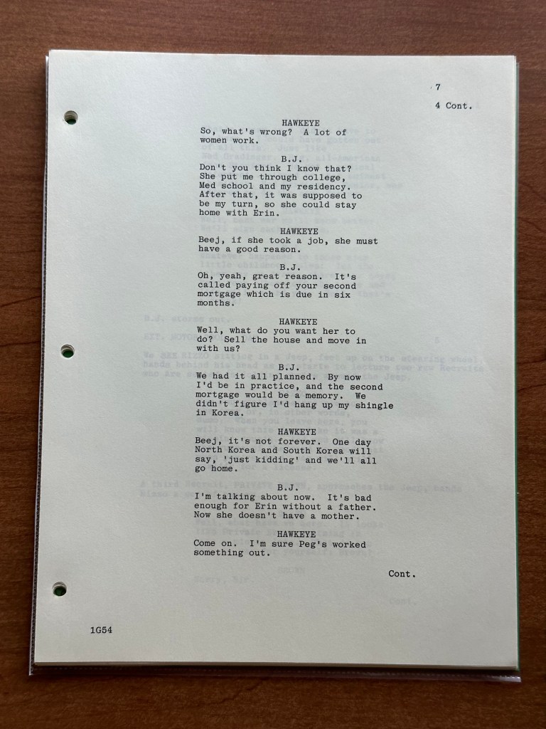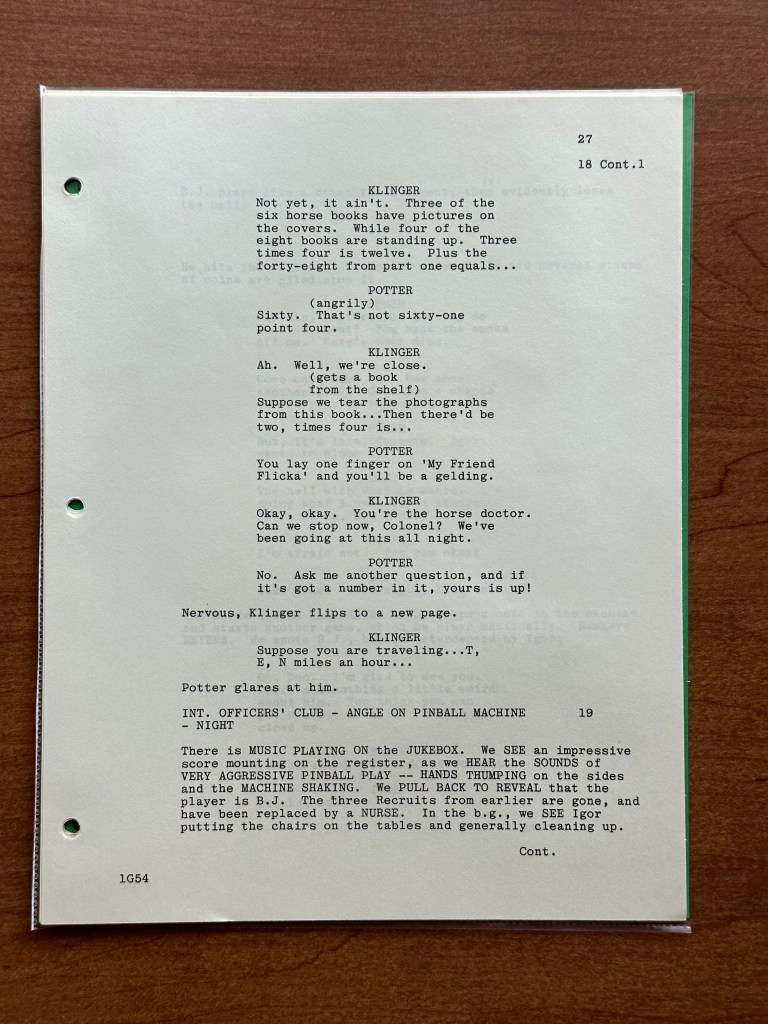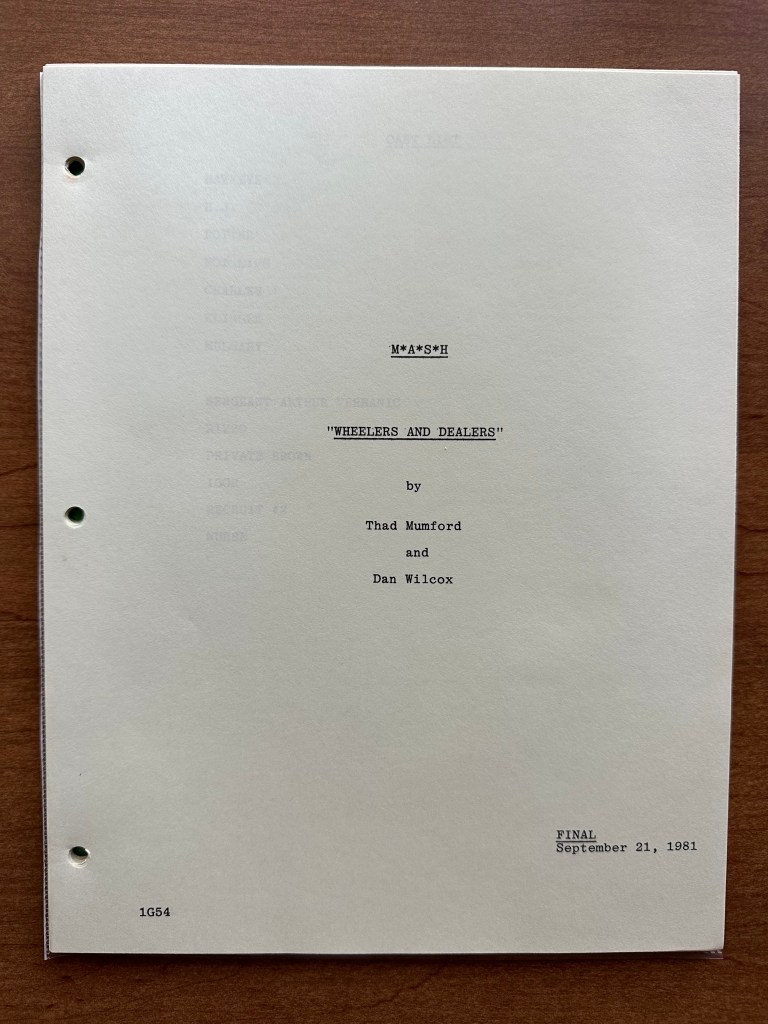 The original script is a final draft dated September 21, 1981. The episode was directed by Charles S. Dubin and written by the writing team of Thad Mumford and Dan Wilcox. Dubin is credited with directing an incredible 44 episodes of the series. Mumford and Wilcox were just as prolific with 36 writing credits to their names. By season ten, Karen Hall was a story editor for the series as well. The writing of M*A*S*H was just as vital as the acting, and the focus on the importance of strong writing was instilled by Larry Gelbart and continued after he left the series.