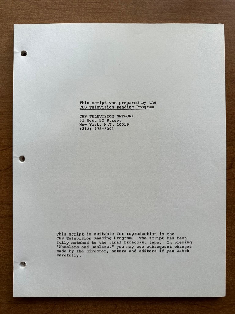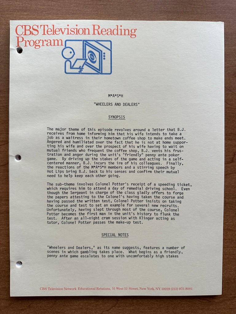 Since August 27th is G.W. Bailey’s birthday, I wanted to feature an episode in which he played a key role. As I was looking through some scripts, I found the episode “Wheelers and Dealers” (10×05), and all I could hear was Rizzo saying “vee-hicle.” That made this the obvious choice since it features Bailey’s comedy talents. As I got this script out, however, I found a second script. One that was clearly a copy, but it was photocopied by CBS for a specific program. I had never heard of the CBS Television Reading Program, so I did some research and found some information. This week, in addition to reviewing the episode, we are going to take a look at two scripts instead of one!