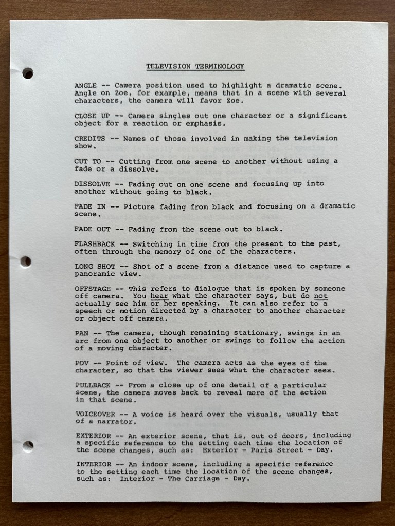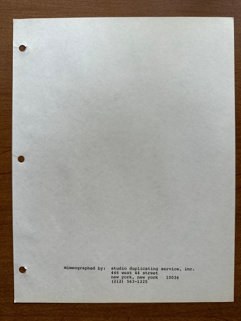 When I first opened this script, I was intrigued because it states, “This script was prepared by the CBS Television Reading Program.” I had never heard of this program, and my initial research didn’t turn up much information either. Using context clues, I figured that this script was likely used in a school setting, and an article I found in The New York Times from 1977 confirmed this. The article states, “The CBS program will provide students in the participating schools with scripts of selected drama specials to be presented on the network. The scripts are to be read both before and during the broadcasts. Subsequently, in the classrooms, ‘enrichment’ exercises will be offered to prompt discussions on the literary and social values in the programs.”