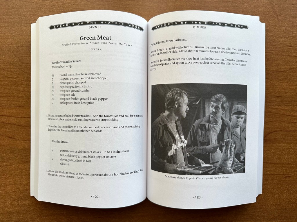 On the podcast M*A*S*H Matters, hosts Maxwell and Ryan Patrick have been teasing the release of this updated edition of the M*A*S*H cookbook for a few months. Maxwell explained that he wasn’t happy with how the publisher was selling sub-par copies book since the publisher had lost the original proof. He acquired the rights to the book from the original publisher and worked with designer Arthur Healey to bring the book back to life. And they have done an excellent job. The new book is in a slightly larger format, the photos look great, the design is clean, and the recipes are often presented with a screenshot or two from M*A*S*H. They could have simply re-released the book as it was when it was published in 1997, but Maxwell took the time to expand it.