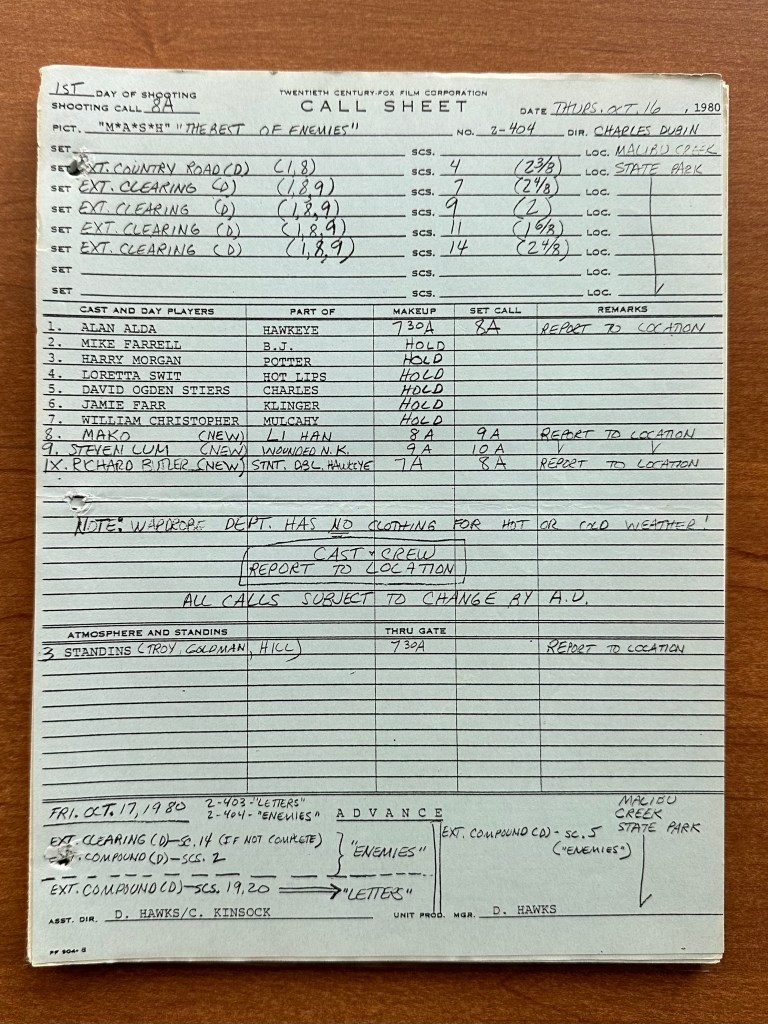 - Thursday, October 16, 1980 – Location: Malibu Creek State Park – No scenes were filmed for “Letters.” All scenes were filmed for “The Best of Enemies” and only required Alan Alda, Mako, and Steven Lum as the wounded North Korean soldier (this role appears to be uncredited).