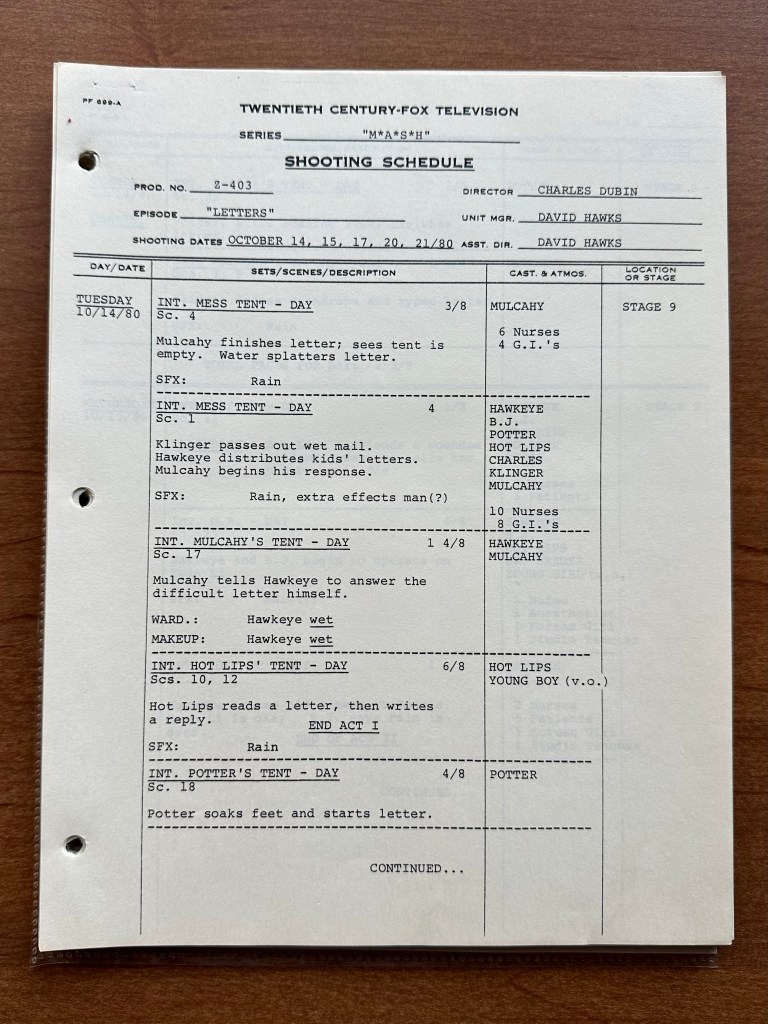 Because this script came from a set that belonged to Frankel, it has the full collection of production documents including Call Sheets, the Shooting Schedule, and his wardrobe sheets. This is not the first script I’ve featured that belonged to him (see posts for “A War for All Seasons” (09×06), “Death Takes a Holiday” (09×05), “No Sweat” (09×11), and the production documents for “Goodbye, Farewell and Amen” (11×16)), so I will not go into great detail about what each document was. Instead, I want to focus on the shooting schedule and the filming location. I’ve been asked about how often they filmed on Stage 9 at Fox vs. Malibu Creek State Park. Using the Call Sheets and Shooting Schedule, I will break down the location and scenes filmed each day.