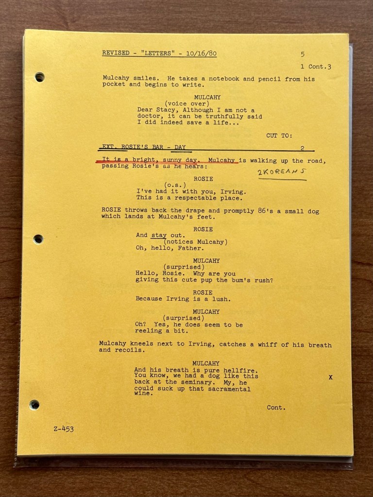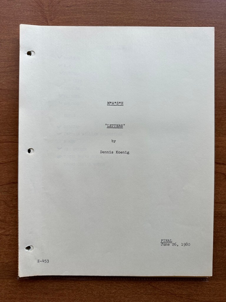 M*A*S*H has a series of episodes involving letters home from the characters. In most of these episodes, we see one character writing home to a family member. “Letters” is unique because each character gets the chance to tell a quick story. We get a glimpse into what each character values, how they respond to children, and how the war has affected them. I was also delighted to see an appearance from Eileen Saki as Rosie in this episode. Overall, the script is pretty close to the final episodes since it has revised pages, but there were a few changes. On page 14, the dying soldier’s name is written as “Frank” but he is called “Mike” in the episode. I imagine someone pointed out how the name Frank could be an issue due to her past with Frank Burns. The letter that B.J. wrote was originally longer (page 22), and Hawkeye’s letter was changed substantially (pages 32 – 33).
