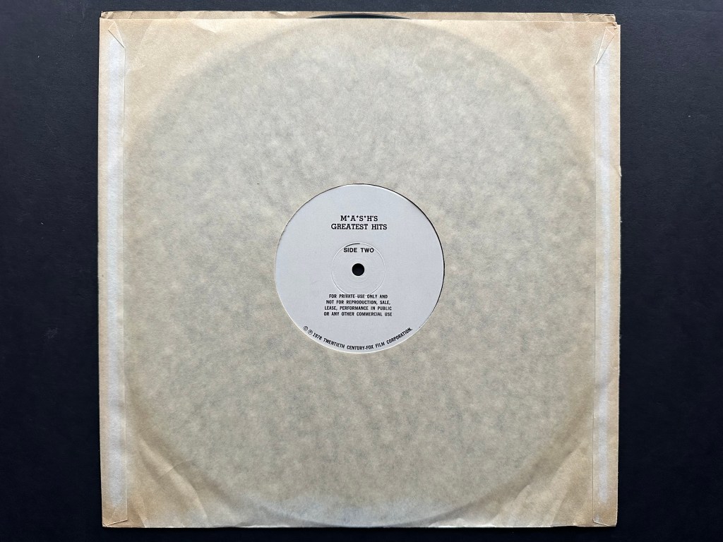 The album included a custom record jacket. The front features an overview the 4077th from the helicopter pad. Wounded had just been removed from a helicopter, and the corpsman are working their way down to the main camp in Jeeps and on foot. The cover features a large red cross and the words “M*A*S*H‘s Greatest Hits.” From the front, you might think this was sold in a record store as a soundtrack for the series. However, when you turn it over to the back, that’s when you discover this is special. There is a standard Twentieth Century Fox copyright notice at the bottom, but it also states that the record is intended “For private use only and not for reproduction, sale, lease, performance in public or any other commercial use.” Not the typical wording on a late 1970s record!