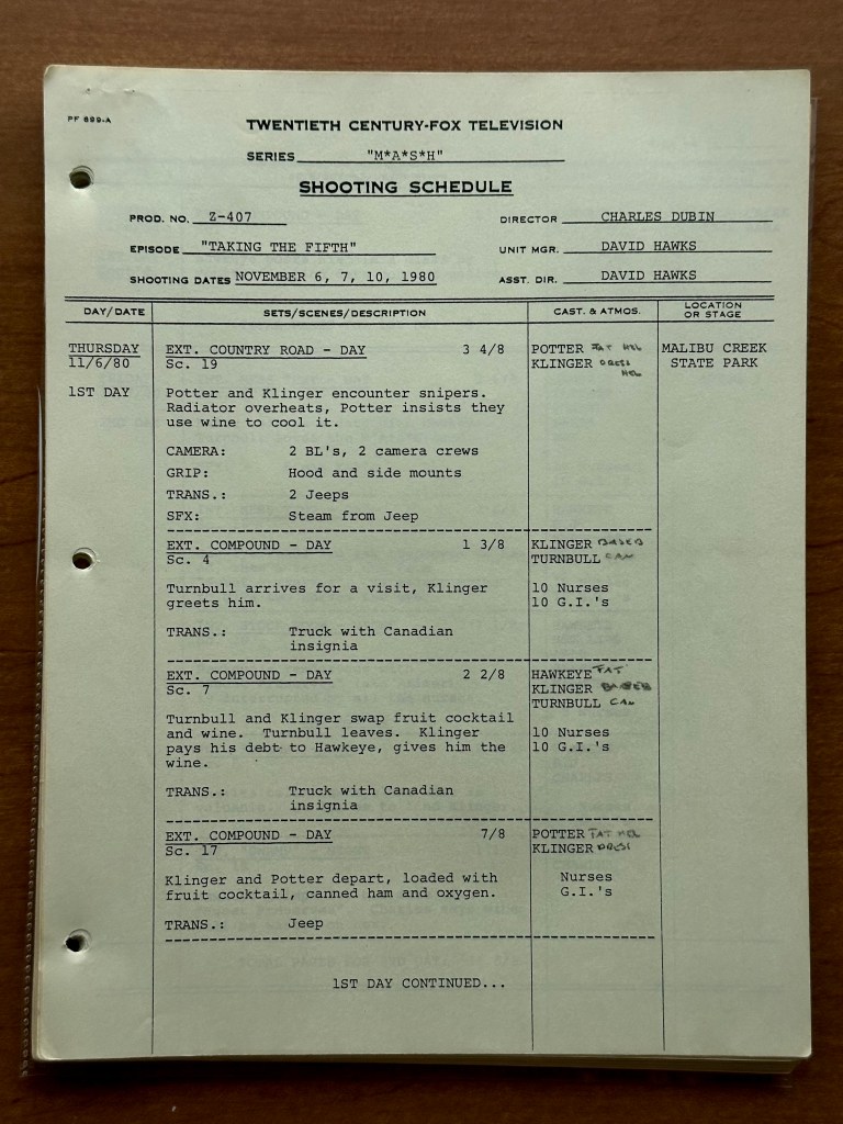 I always enjoy reading through one of Frankel’s scripts. The Call Sheets, Production Requirements, Shooting Schedule, and wardrobe pages provide great insight into the amount of detail and the number of people it took to produce each 26 minute episode. I also have a very strong personal connection to these scripts as they were the first scripts from M*A*S*H that I bought, and they were the first M*A*S*H objects I purchased besides the DVDs that were being released in the mid-2000s. In 2007, a 22 script lot that included the name “Albert” on each cover began the collection that I take great pride in today.