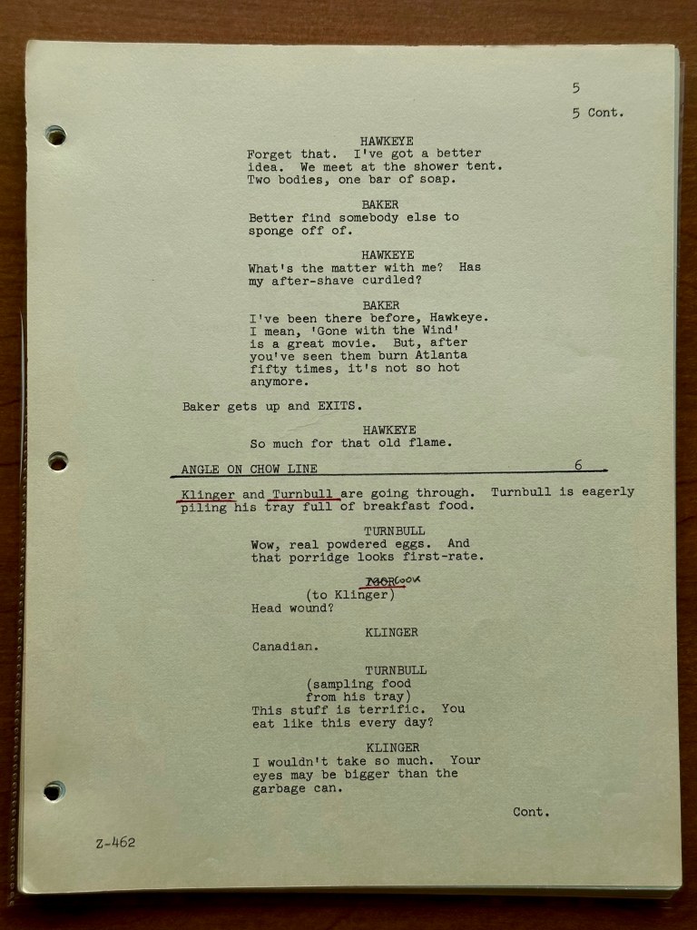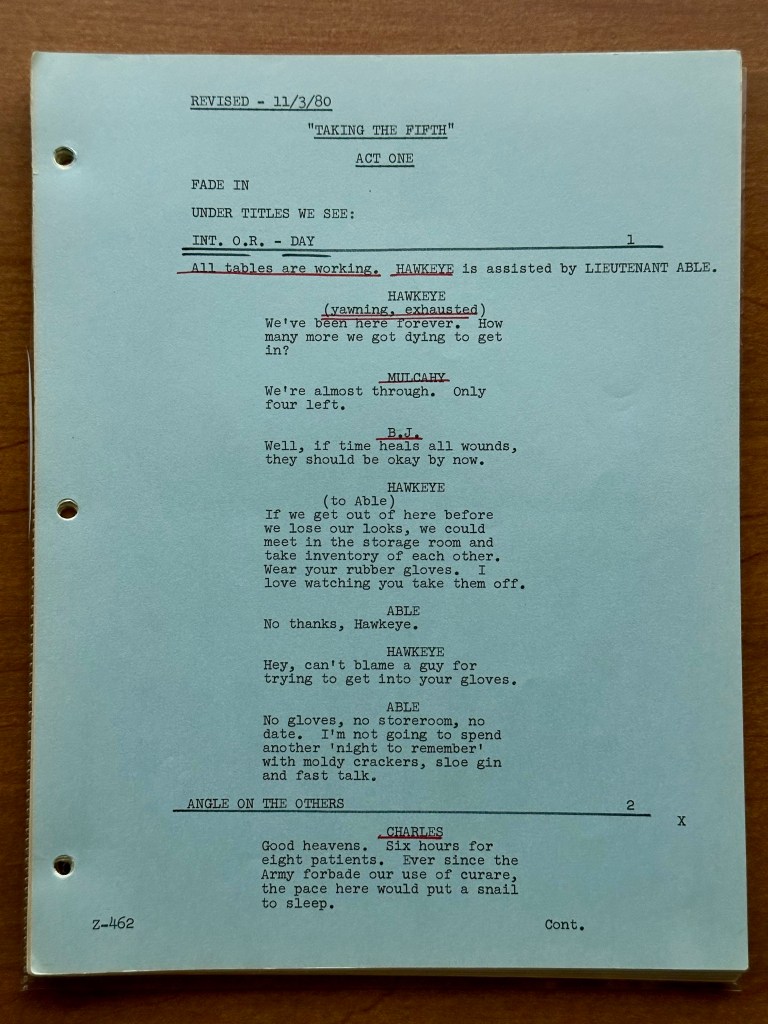 This script is dated October 17, 1980 and was written by the writing team of Elias Davis and David Pollock. They are credited with writing 18 episodes of M*A*S*H and went on to write for other popular series including Cheers and Fraiser. This is a final draft, and it has a bright yellow cover (you can’t miss it). The writing on the front cover indicates that this script belonged to “Albert” in “Wardrobe.” If you’ve followed my site for awhile, you know I have several of Frankel’s scripts including “Letters” (09×02), “No Sweat” (09×11), “A War for All Seasons” (09×06), “Death Takes a Holiday” (09×05), “No Laughing Matter” (09×13), and the production documents for the finale. I owe a lot to Frankel for the collection I have today.