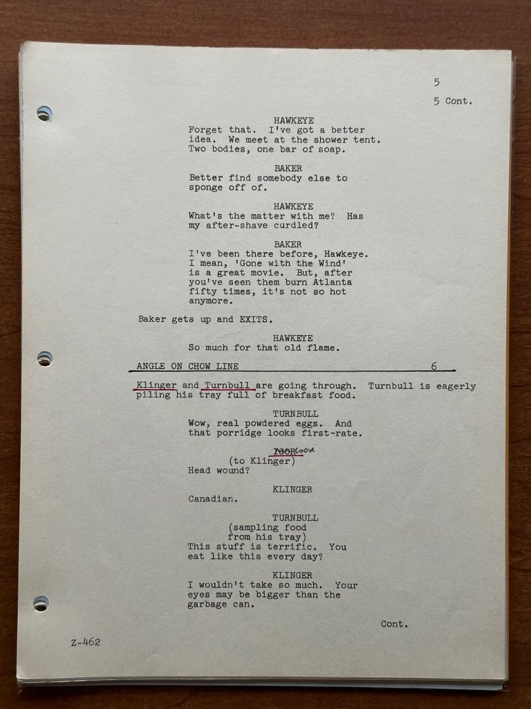 I wouldn’t say that this is one of the strongest episodes of the series, but it is far from the worst. It has some funny moments such as the “Just Married” sign on the back of the Jeep that Col. Potter and Klinger take to the Canadian unit. However, the script for this episode is one of my originals from 2007. It was those 22 scripts that really started my collection, and ultimately led to the creation of this site. Even for an episode that isn’t one of my favorites, seeing a script from Albert Frankel always puts a smile on my face.