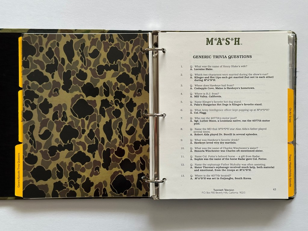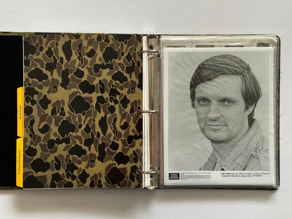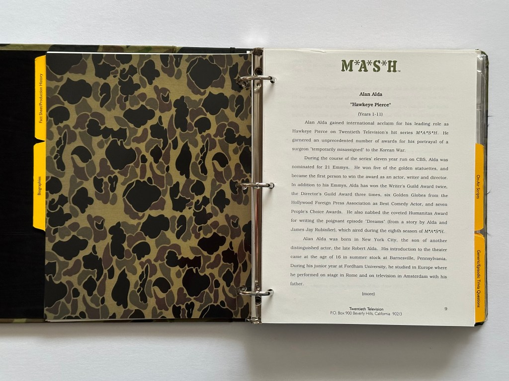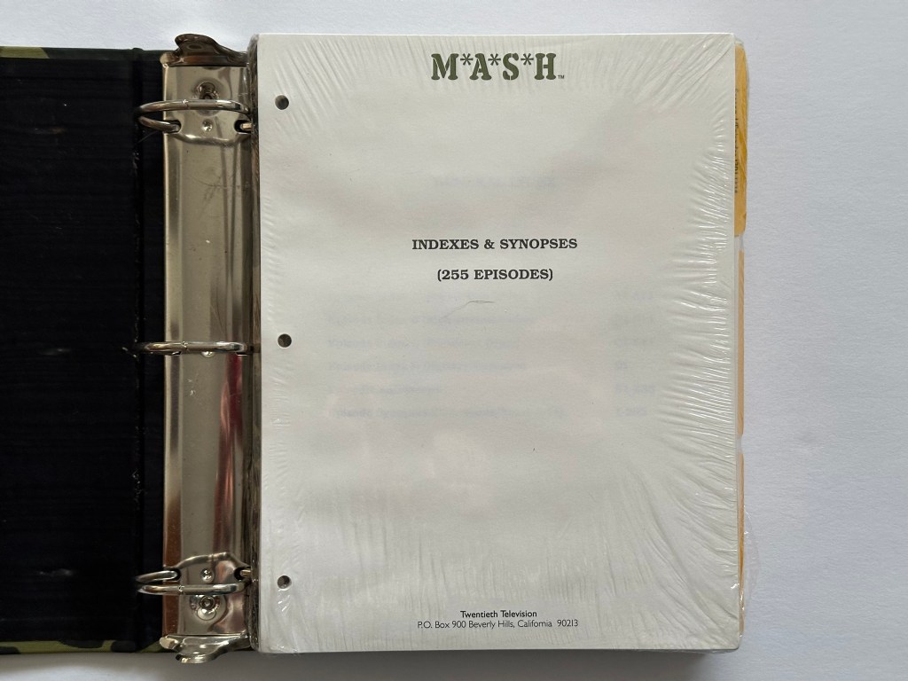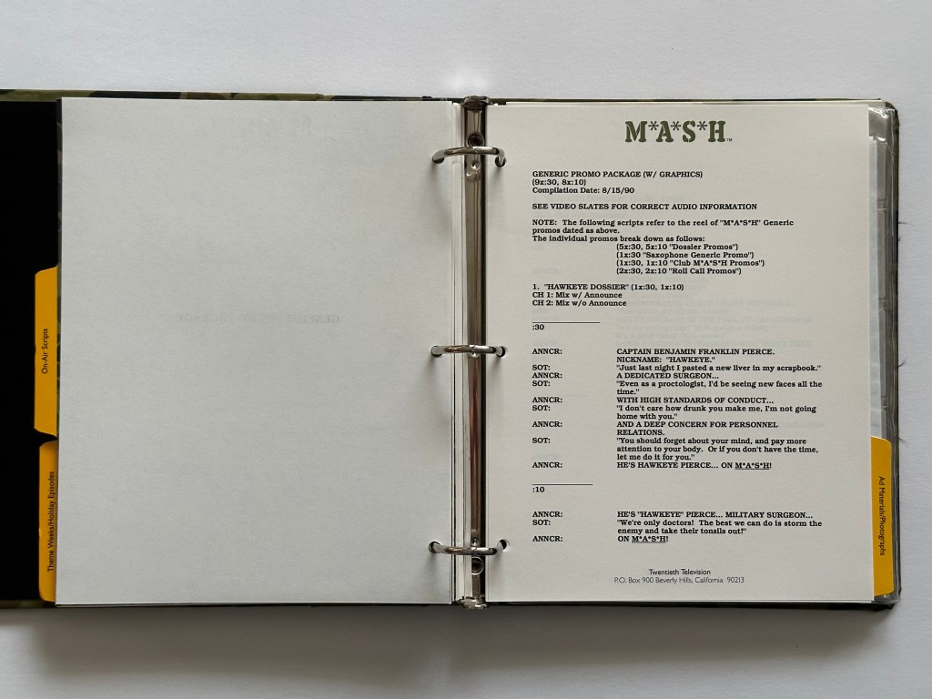 The kit contains two, giant binders with camouflage canvas coverings. The first contains “Synopses” of the series as a whole, each season, and each of the individual episodes. In this binder, all the contents are still sealed in shrink wrap, and I cannot bring myself to open it! You might notice that the cover page says that there are 255 episodes of M*A*S*H and not 251. Both totals are technically correct because there were 251 episodes that originally aired on CBS. However, in syndication, hour-long episodes were broken up in to two half-hour episodes. That increases the total to 255 episodes. This binder would have been an important resource when the station was advertising specific episodes or looking for a specific episode to create theme weeks.