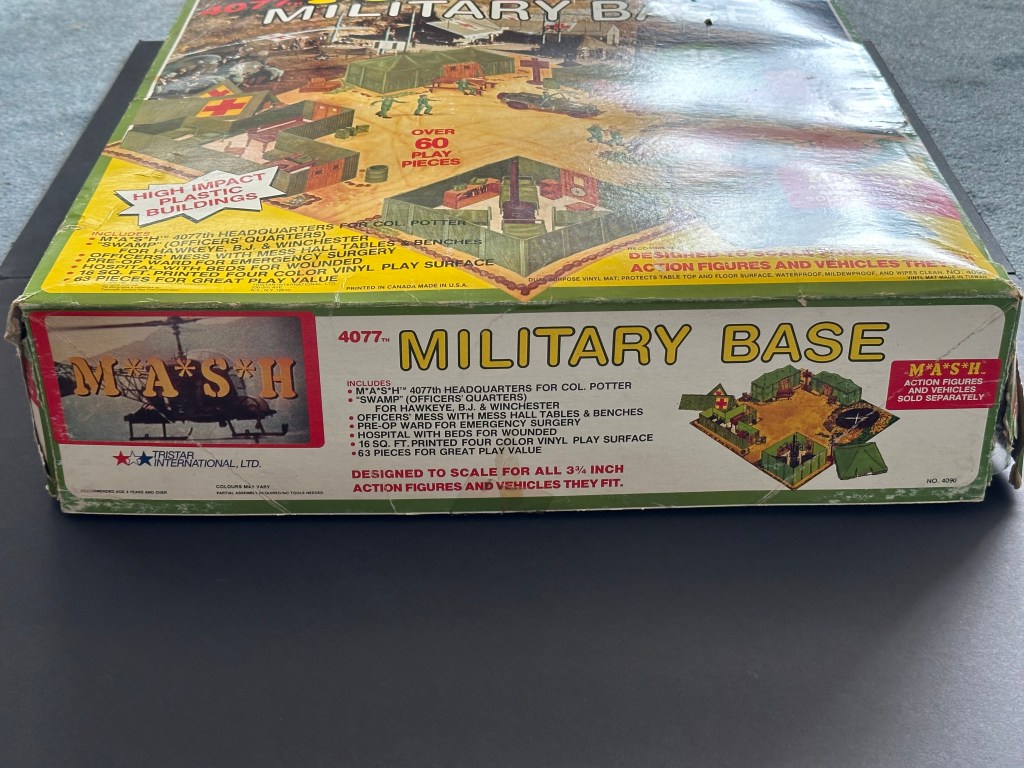 One of the most unique, and popular, licensed M*A*S*H related toys released was made by Tristar in the early 1980s. While I do not typically collect toys and licensed products, I have made a few exceptions. The M*A*S*H Military Base Play Set is something I wanted in the collection for years, and I was able to find a complete, new in box set several years ago. Released by Tristar in 1982, the set includes a 16 square foot play mat, a headquarters tent, The Swamp, the Mess Tent, and the main building complete with Col. Potter’s office, Klinger’s office, the hospital, and post-op ward. The set included 63 pieces for play and could be used with other Tristar toys including a Jeep, ambulance, helicopter, and character action figures. While I do not have any of the extra toys, I do have a full, unused play set, so let’s take a look at this 42 year old M*A*S*H military base play set!