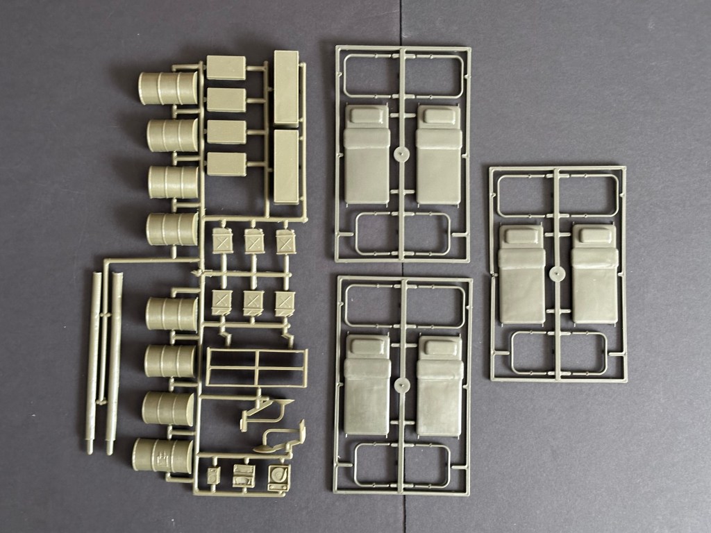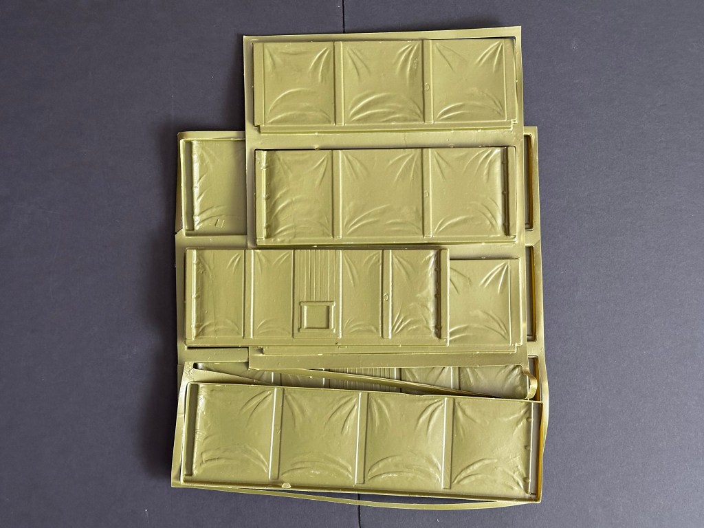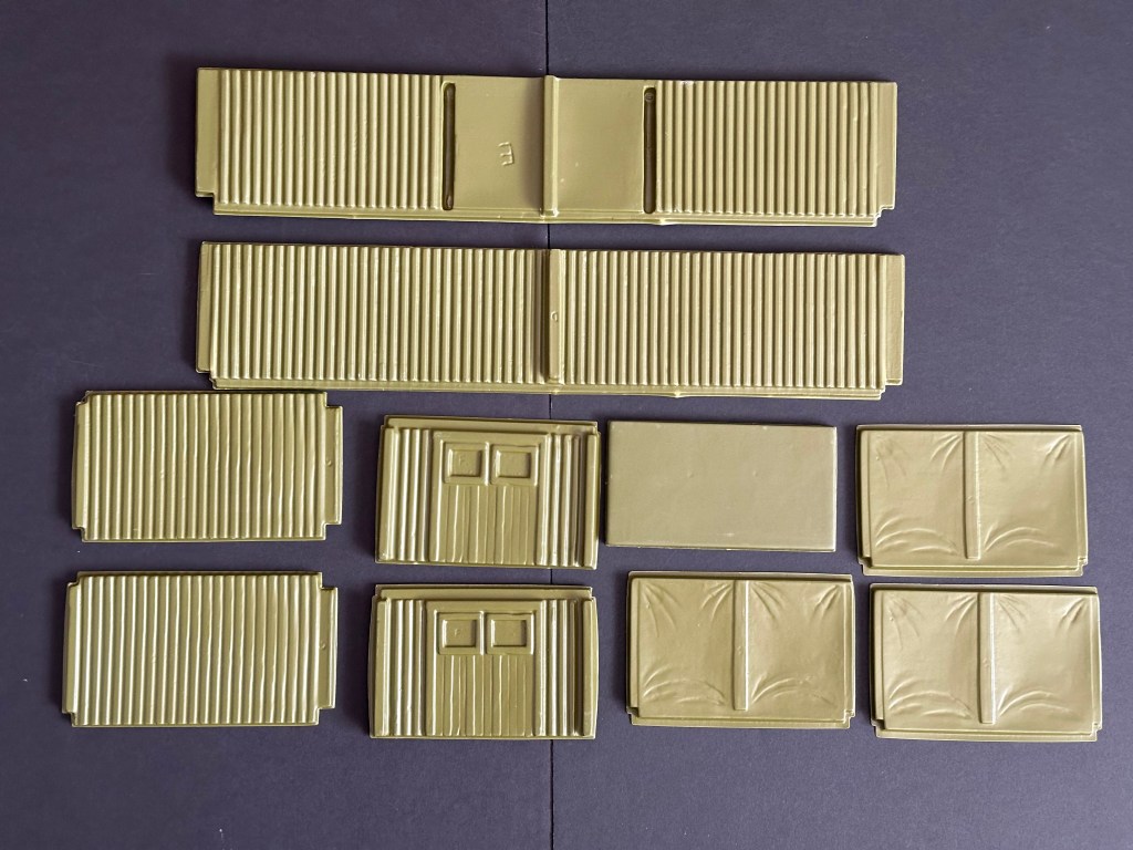 The box states that the buildings are made of “high impact plastic,” but I have found this is not the case. The plastic is very thin and had to be snapped together. It would not have taken too many assemblies and disassemblies for the plastic to start to break. Add 40+ years to the equation, and this plastic is very brittle now. I have to be very careful not to break it. In this set, it is clear that the tents were never assembled because the sides have never been removed from the plastic that holds them together. I have no plans to assemble the set now because I am afraid they’d break!